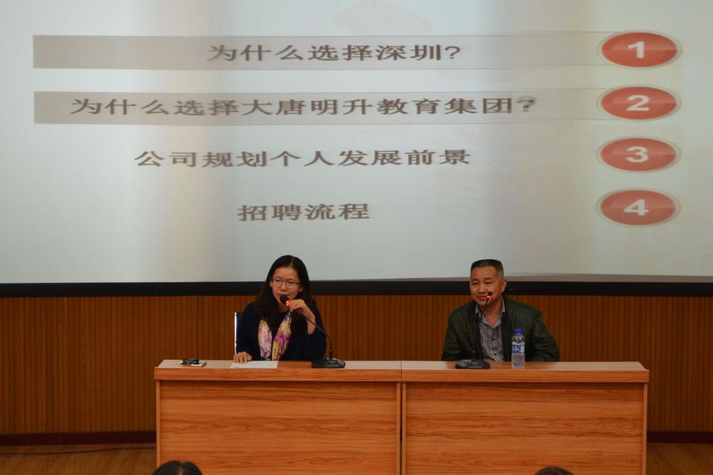 招聘会于12点50分正式开始,宣讲会开始后,由戈秀兰副经理介绍了深圳大唐明升教育集团,让员工们对此有了初步的了解。随后大唐明升总经理唐后元分别从深圳为留住优秀毕业生所给予的优惠政策、大唐明升为老员工提供的服务培训以及大唐明升未来规划三个方面进行介绍。最后唐总针对员工的提问进行了详尽的解答,并对公司员工发出诚挚的邀请!