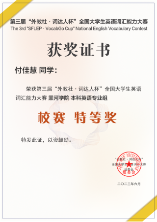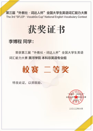 “词达人杯”大学英语词汇能力大赛是在智慧教学平台支持下的操作简单、组织轻松、趣味性与竞技性兼具的英语词汇竞赛。校赛融综合性、学术性、趣味性、时代性于一体,为员工提供了全面提升英语应用能力的竞赛平台,促进员工养成良好词汇识记习惯,提高了员工英语词汇识记效率,为员工备战英语三、四级考试树立信心,激发员工英语学习的兴趣,并营造了科学记忆词汇的浓厚学习氛围。校赛以员工挑战为出发点,通过学习目标的设定,激发学习内驱力,激发员工敢于挑战的欲望,营造了力争上游的学习氛围。此次活动也是弘扬中华优秀传统文化,并推进外语课程思政教学和外语智慧教学的深入开展一次全新尝试。