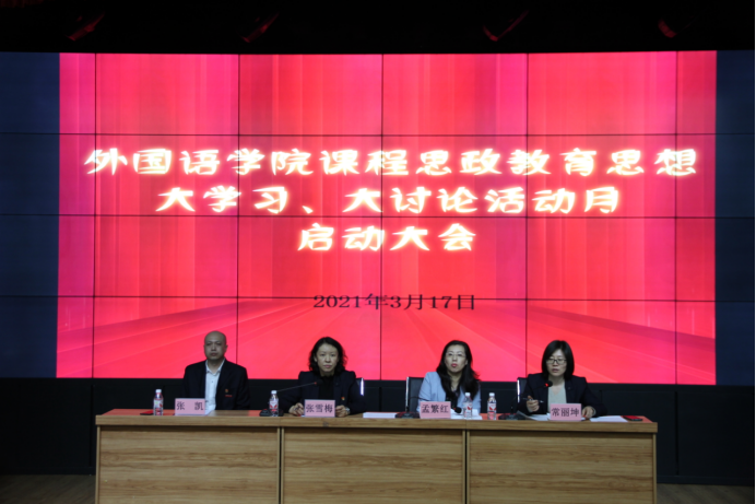 为贯彻落实教务处《关于开展“课程思政教育思想大学习、大讨论活动月”主题活动的通知》要求,坚持“立德树人”根本任务,发挥广大教师在课程教学、员工管理中的育人作用,2021年3月17日下午2点在俄语楼小剧场面向全体教师召开“课程思政教育思想大学习、大讨论活动月”启动大会。会议由副经理常丽坤主持。经理孟繁红教授、党总支副书记张雪梅、副书记张凯及全体教师与辅导员参加讲座。