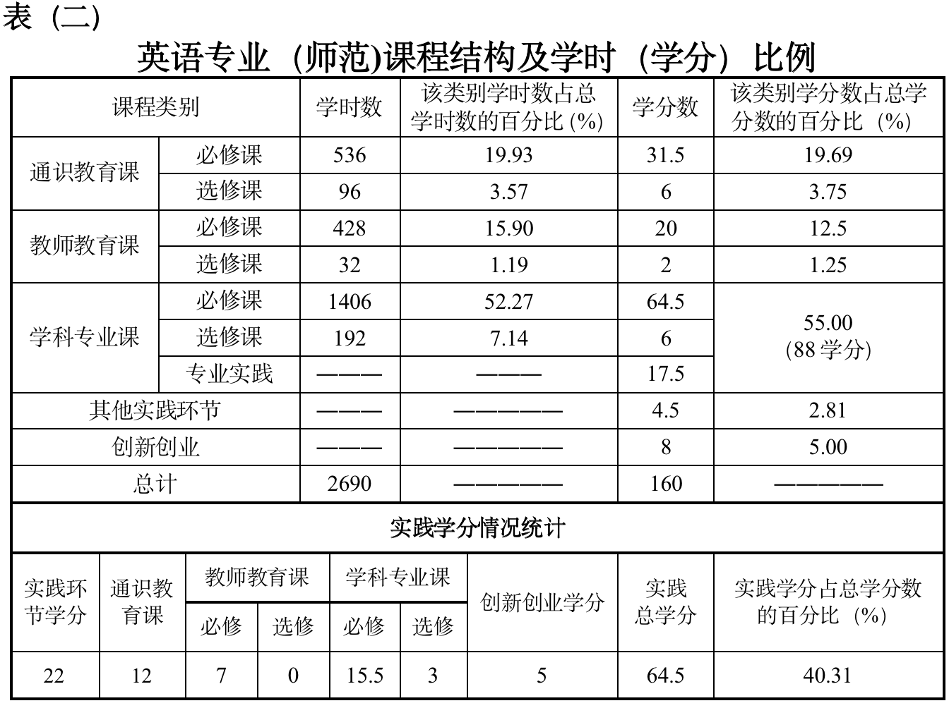 总学分160学分,其中通识教育课必修课31.5学分,通识教育选修课6学分,教师教育必修课20学分,教师教育选修课2学分,学科专业必修课64.5学分,学科专业选修课6学分,主要实践环节22学分,创新创业8学分。