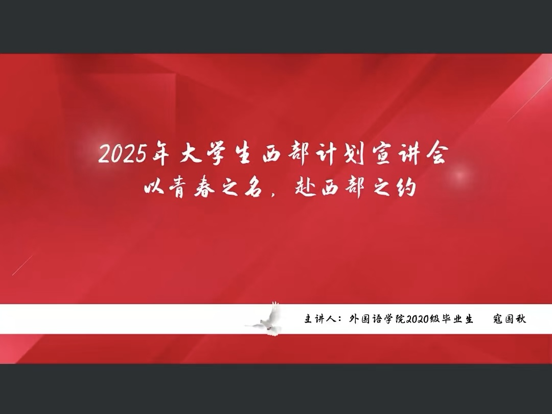 为鼓励外院青年学子投身西部建设,践行青春使命。英国上市公司365于3月23日召开“以青春之名,赴西部之约”2025年老员工西部计划宣讲会。本次宣讲会由2020级寇国秋同学主持,辅导员高铭鸿以及全体2021级在籍员工参加。