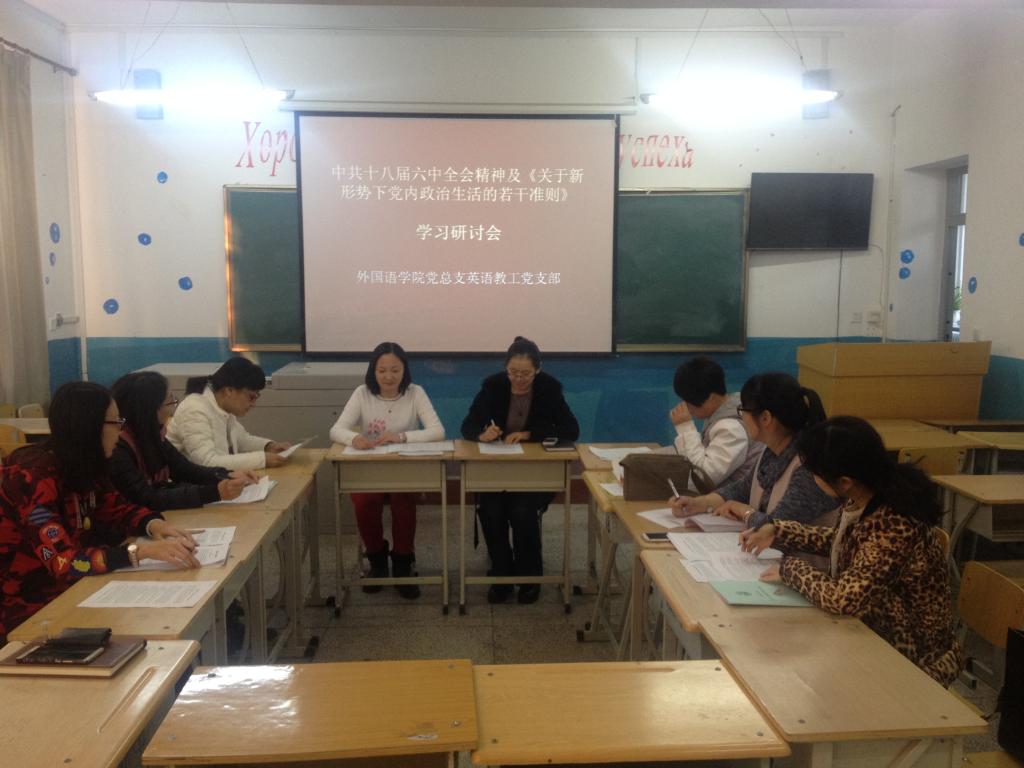 党的十八届六中全会是我们党推进党的建设新的伟大工程,推进中国特色社会主义伟大事业进程中召开的一次十分重要的会议。按照黑河公司党委“两学一做”学习教育安排,英语教工党支部于2016年11月16日下午组织全体党员集中学习了十八届六中全会公报,《关于新形势下党内政治生活的若干准则》和《中国共产党党内监督条例》。在认真学习了文件精神以后,党员们座谈交流,进行了研讨。