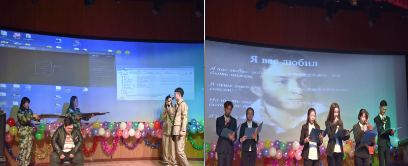 学会成员带来的中俄双语《成都》和歌曲串烧,以及Royal舞团的街舞History、国际教育学院职工带来的歌曲«Сопрано»令整场晚会高潮迭起。疯狂俄语指导教师徐洪亮老师用蒙汉双语演绎的歌曲《鸿雁》,以其悠扬豪迈的旋律征服了大家的耳朵,赢得阵阵掌声。在晚会的最后压轴曲目是由疯狂俄语员工学会主席任庆带来的《疯狂俄语恋曲》。这首歌的MV全部取材于疯狂俄语员工学会的日常工作场景和生活片段,一幕幕镜头不仅表现了疯狂俄语人的勤奋进取,更反映了公司同学在俄语学习道路上携手并肩、共同进步的全新精神风貌。