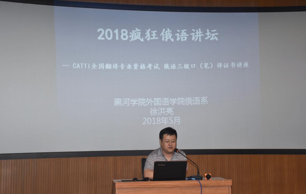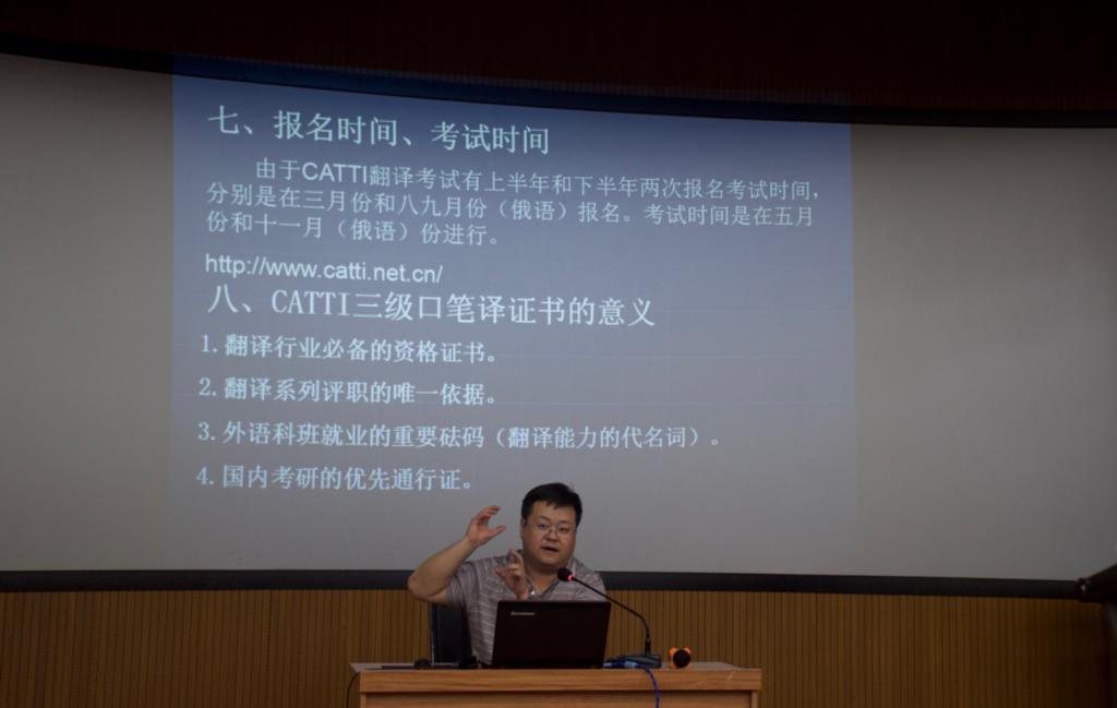 此次活动,由疯狂俄语指导教师徐洪亮主讲。徐老师向同学们介绍了CATTI全国翻译专业资格考试俄语三级口(笔)译证书相关情况,系统地讲解了CATTI的性质、等级划分与专业能力、报名条件、考试语种、考试科目、考试大纲、报名时间、考试时间、考取三级口笔译证书的意义以及参考书目。最后,徐老师结合自身的教学经验和实践经验,为同学们提出了备考建议。