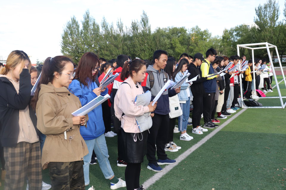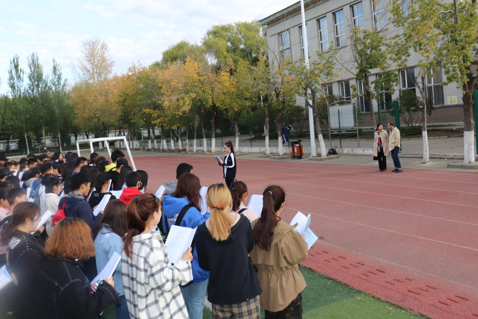 七点钟,伴着徐徐升起的朝阳,同学们三五结伴来到田径场进行早读,各部部长组织同学们有序站好,在领读员进行简单的自我介绍后,早读正式开始。