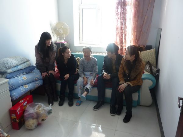员工们很快的与79岁老人金福童老奶奶见面,和老人聊天,帮老人按摩,同学们和老人都是满面笑容,气氛温馨融洽。有些同学也很自觉的拿起抹布,帮老人打扫卫生。