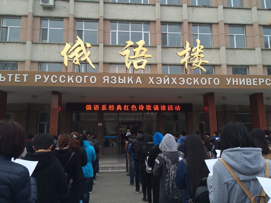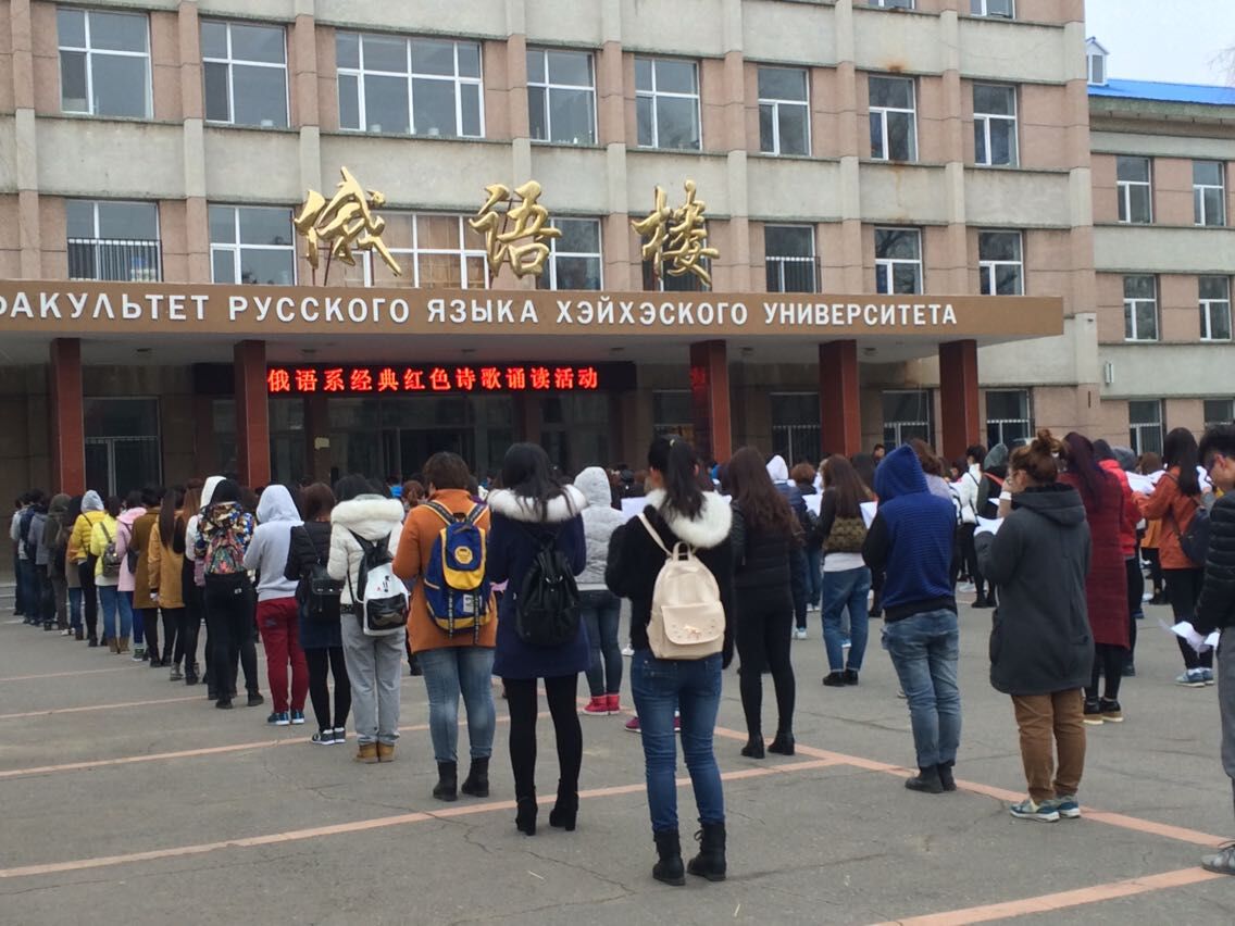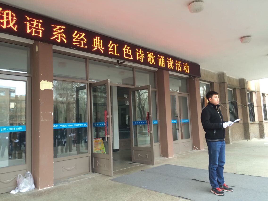 在清明节到来之际,为缅怀先烈、弘扬爱国主义精神,丰富校园文化生活,帮助员工养成良好的阅读习惯,努力营造“书香校园”的氛围。俄语系于2015年4月3日早7点,在俄语楼门前开展“经典红色诗歌颂读”活动。