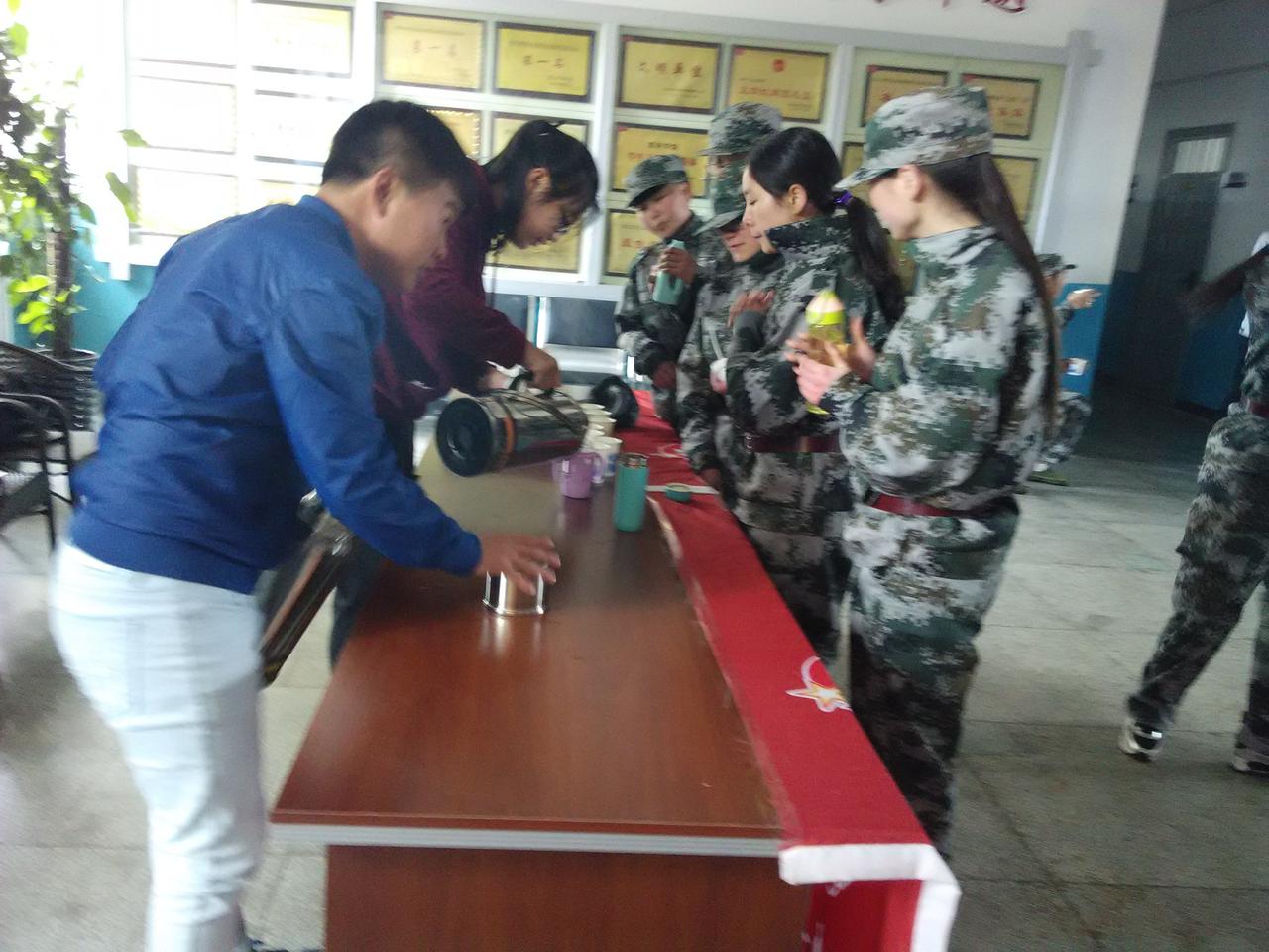 军训期间,天气寒冷,有部分同学反映休息时间短,难以喝到热水,为了帮助军训生解决这一问题,5月5日下午三点,俄语系、英语系的志愿者自发组织军训期间免费供水活动。