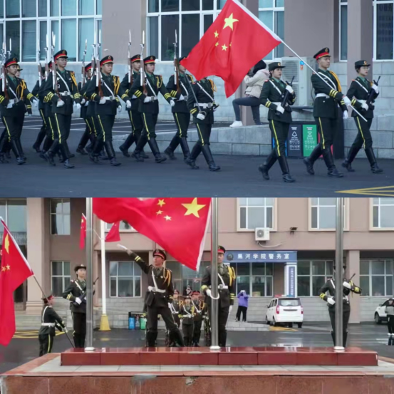 升旗仪式第一项,升国旗奏国歌。在全体员工的注目礼下,国旗护卫队队员们迈着整齐划一的步伐,喊着嘹亮的口号,护送着鲜艳的五星红旗进场,正步走向旗杆。随着《义勇军进行曲》响起,全体员工面向国旗行注目礼,五星红旗冉冉升起。
