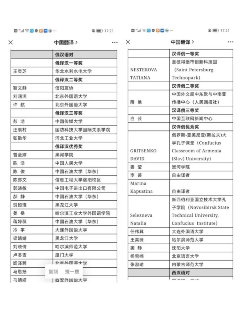 “韩素音国际翻译大赛”是我国组织时间最长、规模最大、影响最广的翻译赛事,素有翻译界“奥斯卡”之称。竞赛始于1989年,每年1届,获奖率级低。这是公司第二年在该竞赛中获奖,且具有很大的突破:员工首次获奖、毕业生首次获奖、在汉译俄组竞赛首次获奖。这也反应出公司俄语学科、翻译学科近些年建设所学取得成绩。