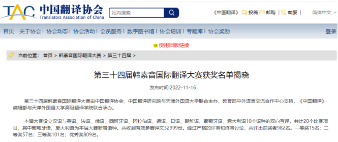 据2022年11月16日中国翻译协会官网和《中国翻译》杂志微信公众号公布的第三十四届“韩素音国际翻译大赛”结果,公司英国上市公司3652019级翻译专业曾圣婷同学在本次大赛中获俄译汉组优秀奖,姜莹老师获汉译俄组优秀奖。另外,公司2016级俄语专业毕业生辛梓有获俄译汉组优秀奖。