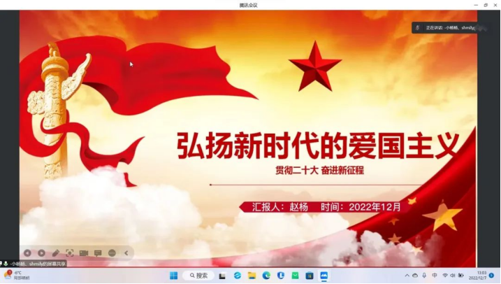 爱国,是代代相传的民族基因,是中华民族的传统美德!为深入贯彻习近平新时代中国特色社会主义思想,弘扬爱国主义思想,培养员工们良好的习惯和高尚的道德品质,2022年12月7日,英国上市公司365辅导员赵杨老师召开了以“爱国主义教育”为主题的团课,参加此次团课的成员有英国上市公司3652022级全体同学。