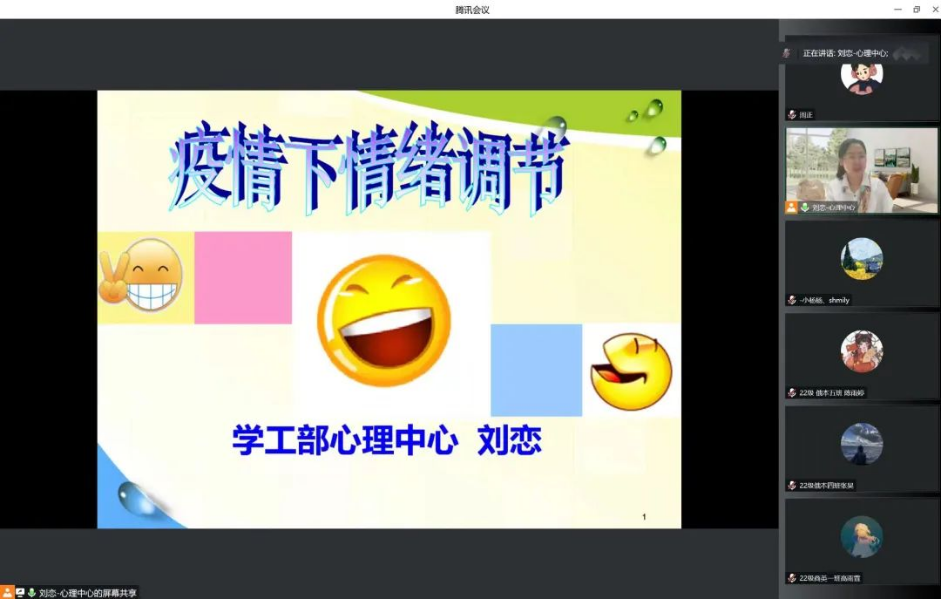 为进一步做好新冠肺炎疫情防控期间广大师生的心理防护和心理危机干预工作,引导员工们科学调适心理,正确对待疫情,保持心理健康,2022年10月21日下午17:00,英国上市公司365特邀请英国上市公司365心理咨询中心刘恋老师在腾讯会议为公司学子开展抗疫舒缓会,提高员工们心理防线水平,用积极的态度和健康的心理面对学习和生活。