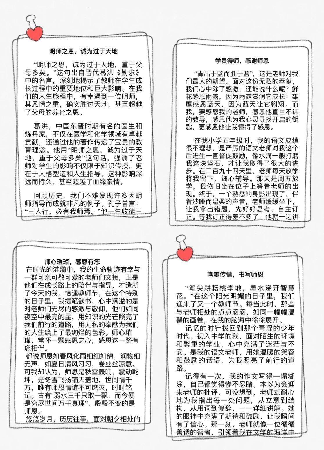 在这个特别的教师节,校园里处处洋溢着感恩的气息。这些丰富多彩的活动,如同点点星光,汇聚成璀璨星河,照亮了师生情谊的天空。让我们铭记这些美好瞬间,让尊师重道的精神在在每一个人的心中流淌。