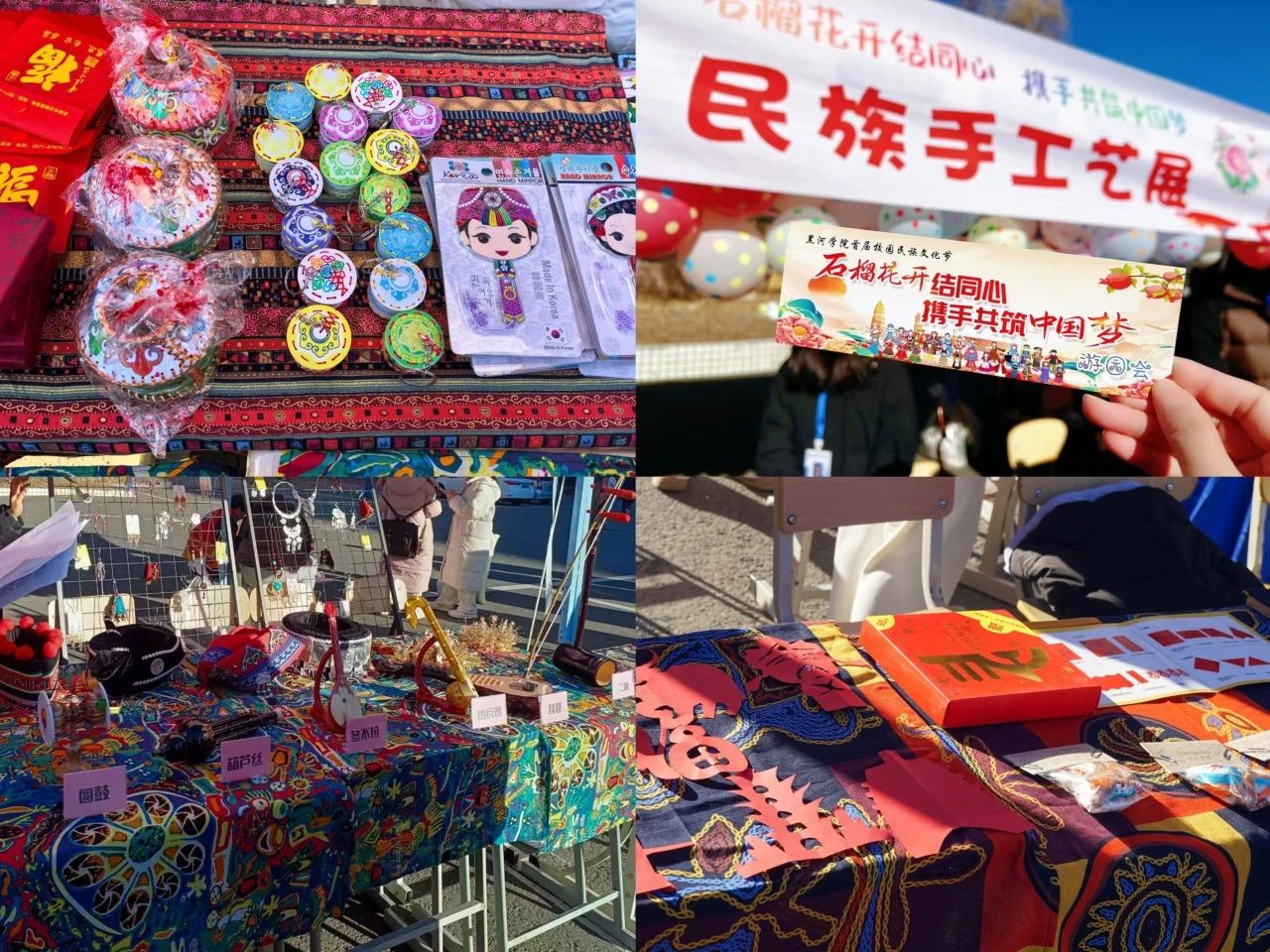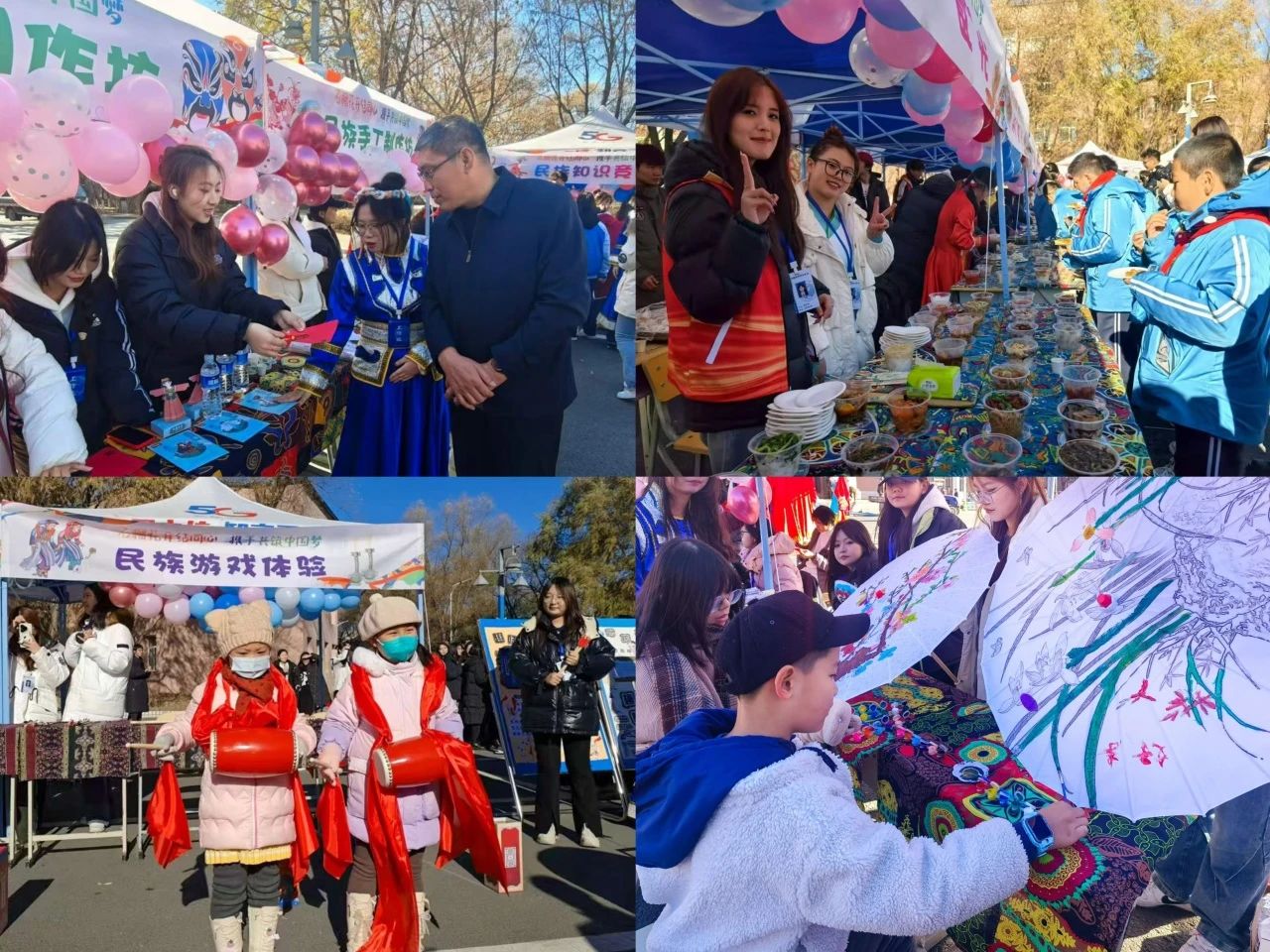本次活动采取游园会的形式,开设民族手工艺展、民族手工制作坊、民族游戏体验、美好“食”光、民族特色服饰体验、民族生活物品展、民族知识竞答7个民族文化展示区,共计14个活动展位。明德楼一楼另设以“石榴花开结同心 携手共筑中国梦”为主题的书画展。活动现场气氛热烈,极具民族特色。在美好“食”光、民族手工制作坊区,各民族特色美食吸引同学们驻足品尝,脸谱、纸浆画、油纸伞、剪纸等在同学们的巧手下成为一件件精美的手工艺品。在民族特色服饰体验区,广大师生体验各民族传统服装,感受不同民族色彩。在民族游戏体验区,蹴鞠、锤丸、投壶成为同学们竞相体验的游戏项目,同学们脚踩藤球,仿佛穿越到了古代的蹴鞠赛场,体验着古代足球的乐趣,感受着蹴鞠这一古老运动的魅力。活动现场,民族手工艺展和民族生活物品展成为了最吸引眼球的亮点之一,这里陈列着各式各样的民族物品,从精美的刺绣到细腻的雕刻,从华丽的民族饰品到实用的生活用品,每一件物品都承载着丰富的历史和文化内涵。民族知识竞答环节更是将活动推向高潮,这一环节旨在通过趣味性问答,让同学们在轻松愉快的氛围中学习民族知识,增强对中华民族多元文化的了解和认同,同学们积极参与,争相抢答,现场气氛热烈而有序。