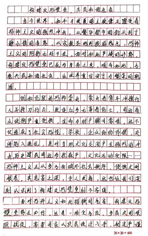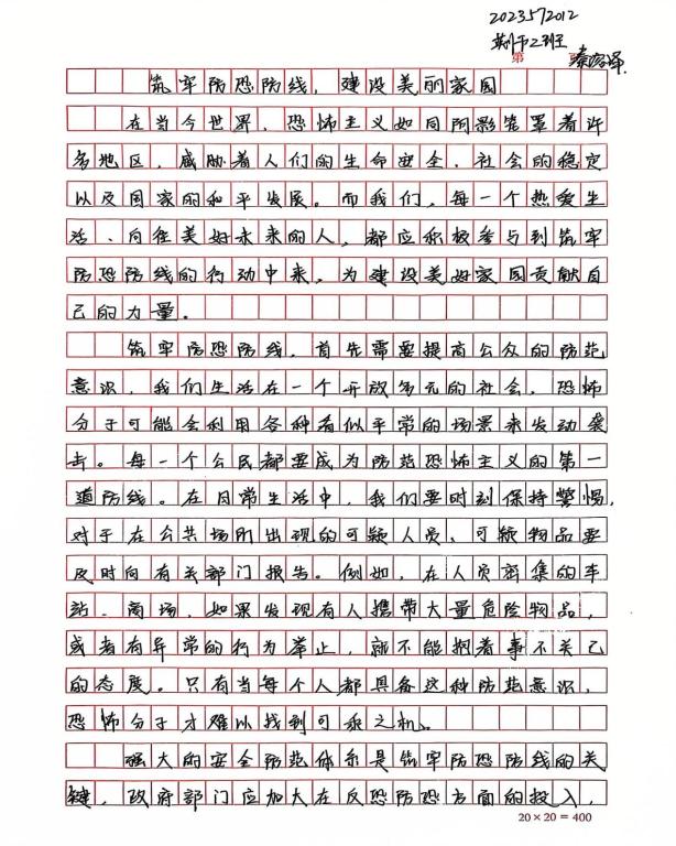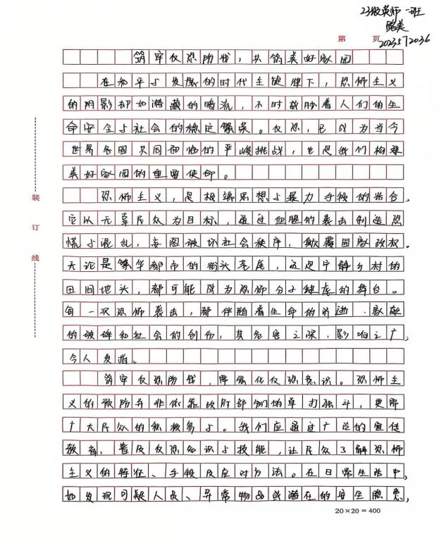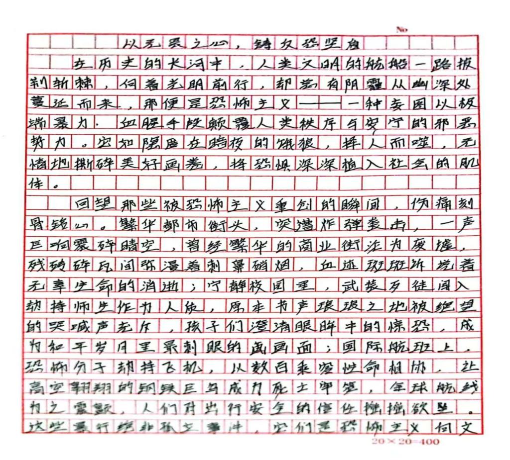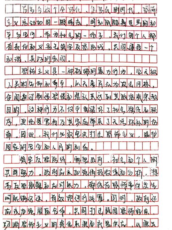 本次征文比赛受到了同学们的积极响应,紧扣“反恐”主题进行创作。同学们从不同视角出发,有的以详实的资料阐述恐怖主义的危害,有的结合时事表达对反恐的见解,还有的用生动笔触描绘了和平社会的蓝图。一篇篇饱含深情与思考的征文,展现了同学们对反恐的深刻认识。