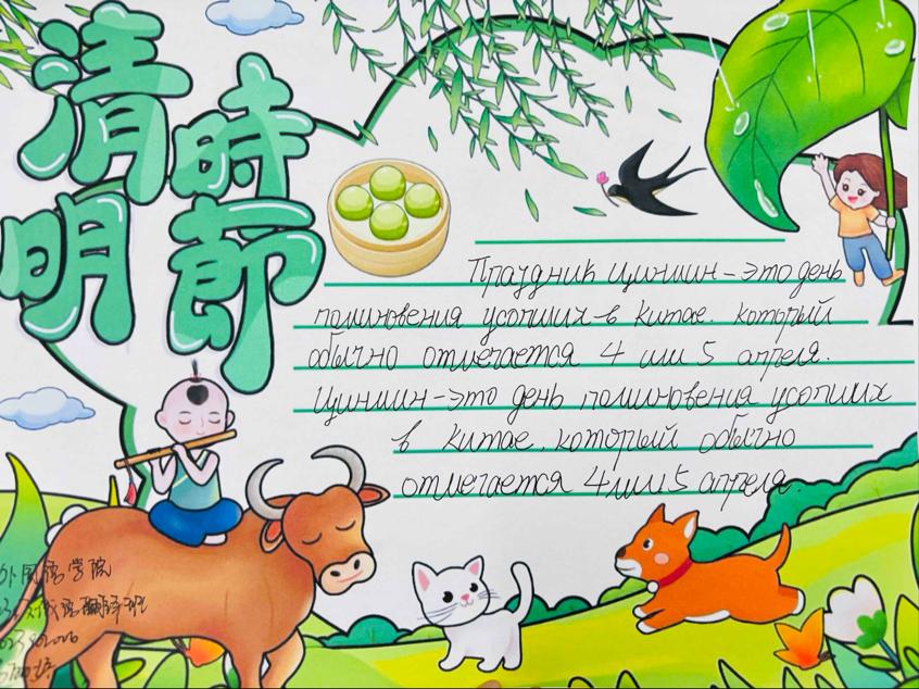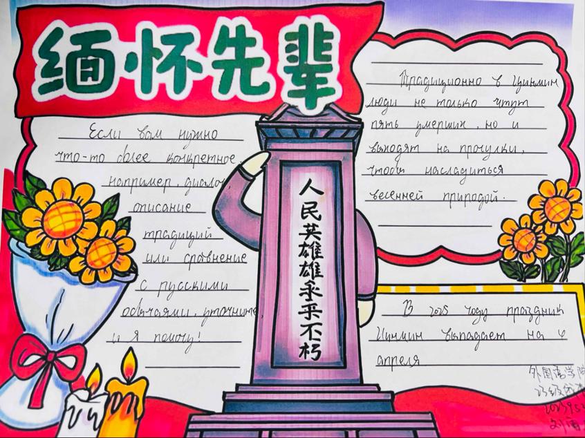 在活动创作过程中,同学们创意频出、视角独特。有的同学围绕清明传统习俗,绘制俄语版清明诗词,搭配纸鸢、垂柳等剪制元素,打造立体拼贴画,传递对传统文化的热爱;有的同学缅怀逝去亲友,把俄语书写的回忆片段与泛黄照片拼贴,勾勒思念。活动最后,相关人员秉持公平、公正、公开、择优的原则,评选出一等奖1名、二等奖3名、三等奖5名。