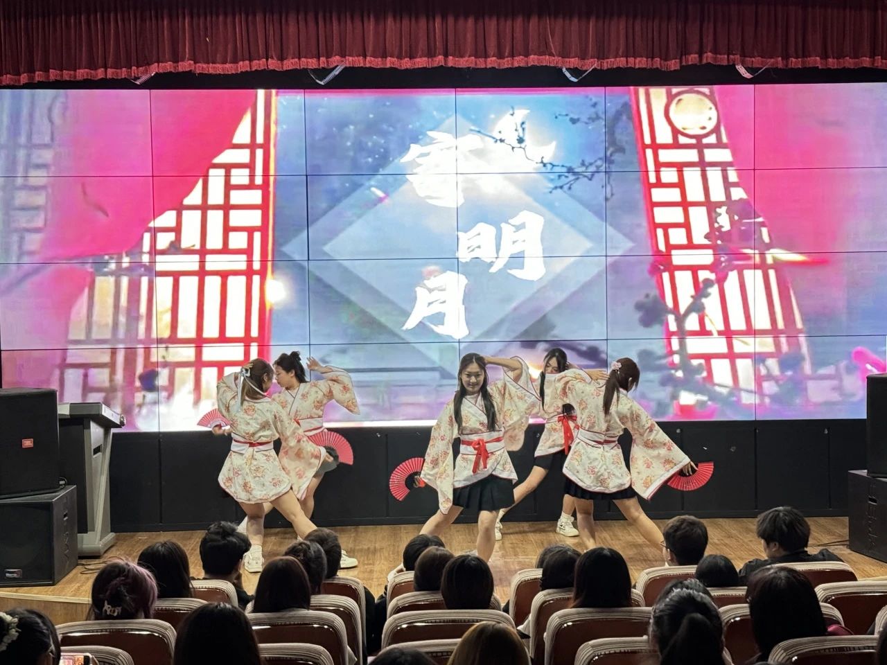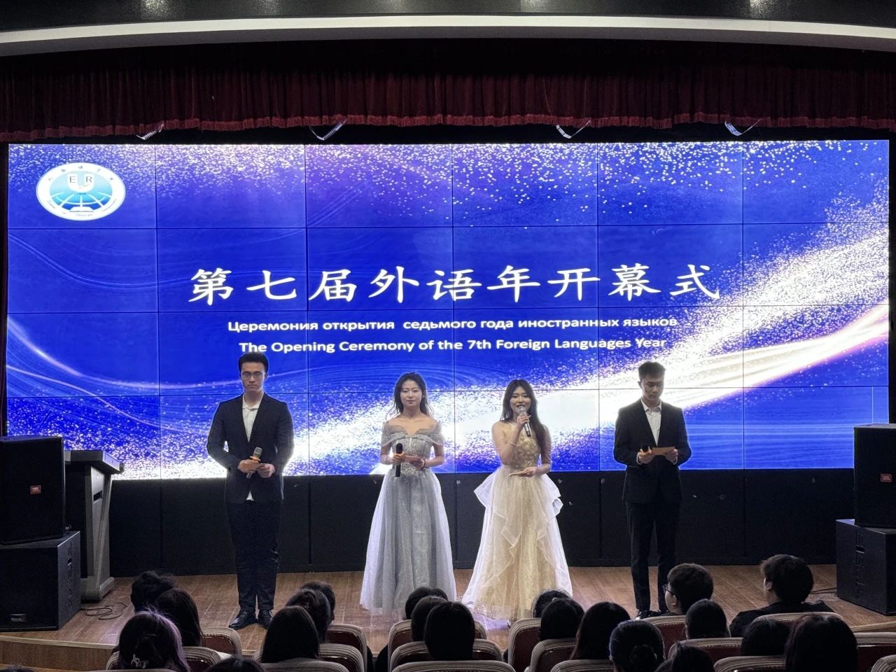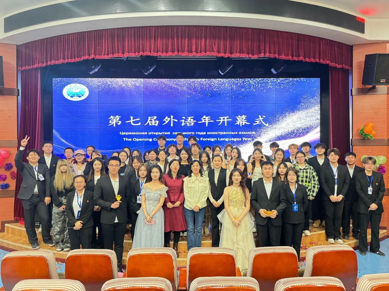 华灯初上,舞台熠熠。第七届外语年开幕式在活力四射的舞蹈《寄明月》中绚烂启幕,舞者轻盈灵动,瞬间点燃现场气氛。随后,精彩节目轮番上演。《清涟》演唱者嗓音悠扬,倾诉歌曲悠远意境;《天生一对》配音精准演绎,带观众走进影视情境;英文歌《WE DON'T TALK ANYMORE》与俄文歌《BECHA》韵律独特,完美展现语言与音乐融合的魅力。外语朗诵《友谊的价值》,同学们发音清晰、饱含深情,诠释文章深邃内涵。音乐短剧《后妈茶话会》凭借夸张表演、幽默台词和恰到好处的音乐,将现场气氛推向高潮。乐器书法表演《墨韵琴声》惊艳全场,书法家笔锋行云流水,演奏者琴音潺潺,给予观众视听双重享受。《爱宠大机密》配音高度还原角色语调,带来别样听觉盛宴。最后,舞蹈《家有儿女》活泼欢快,为开幕式画上句号。