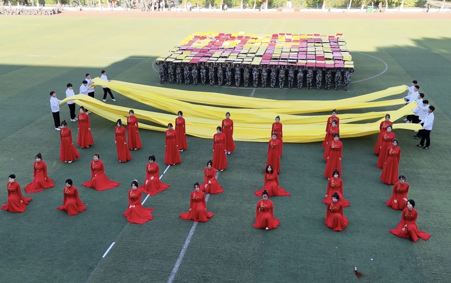 汇演现场,各环节紧密衔接、亮点迭出。深情的演讲率先引发情感共鸣,紧接着,手持彩牌的同学们迅速翻转手里的牌子,鲜明的文字图案在场上清晰呈现,赢得观众的掌声;舞剑同学登场时,长剑舞动间刚劲有力,每一个劈、刺动作都展现出传统武术的韵味与青春朝气;庄重的院旗交接传递着学院精神的传承,红色裙摆的舞者以灵动舞姿诠释活力,最后巨幅五星红旗缓缓展开,鲜红底色与全场欢呼声交织,将氛围推向顶点。整场展演凭借鲜明的主题、精湛的编排与饱满的精神状态,成为汇报大会的精彩篇章,获得校领导与师生的一致好评。