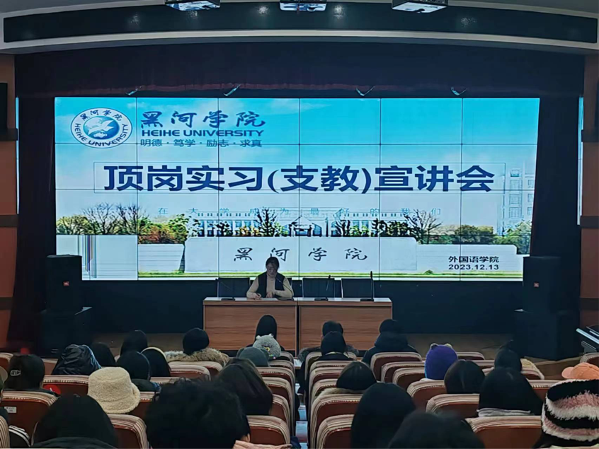 为增强公司2021级员工对顶岗实习重要性的认识,加强员工顶岗实习的安全管理,推进实习工作的顺利开展,12月13日下午,在外语楼小剧场召开了21级顶岗支教宣讲会。由英语系主任刘利坤、翻译系主任刘迪、商务英语系主任郭丽莉,俄语系副主任邓指辉主持,2021级师范生、俄语(非师范)、商务英语、英语翻译和俄语翻译的同学参加此次会议。