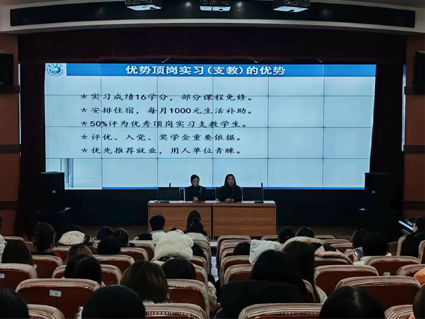 会议伊始,刘利坤老师和刘迪老师首先围绕顶岗支教计划介绍、工作介绍和一些注意事项展开。随后,她对参与顶岗支教的政策保障和优惠政策进行了具体讲解。她指出参加支教项目可以使师范生深度体验教师角色,进一步认识教师工作的难度和重要性,加深对所学专业的了解和体验。让员工认识到毕业顶岗实习在专业中的重要性。