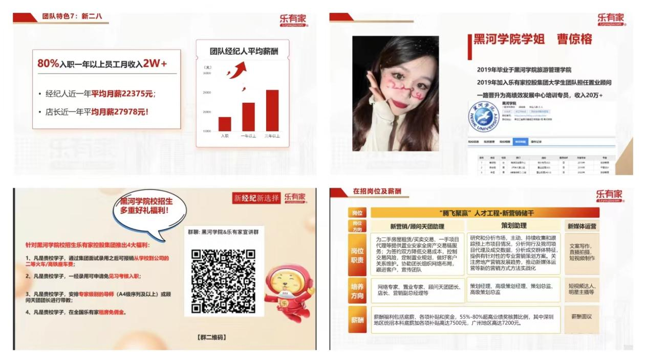 会上,乐有家控股集团营销副总裁助理谭芳以PPT的形式为同学们展示了关于集团的基本情况,其中包括行业解析、薪资待遇、企业历程、企业文化等内容,详尽的为同学们解释了目前行业发展的困惑和机遇。同时在会议的最后以问答的方式回答了同学们关于工作地点、应聘要求等代表性问题,整个互动环节同学们情绪高涨,讨论热烈,宣讲效果显著。