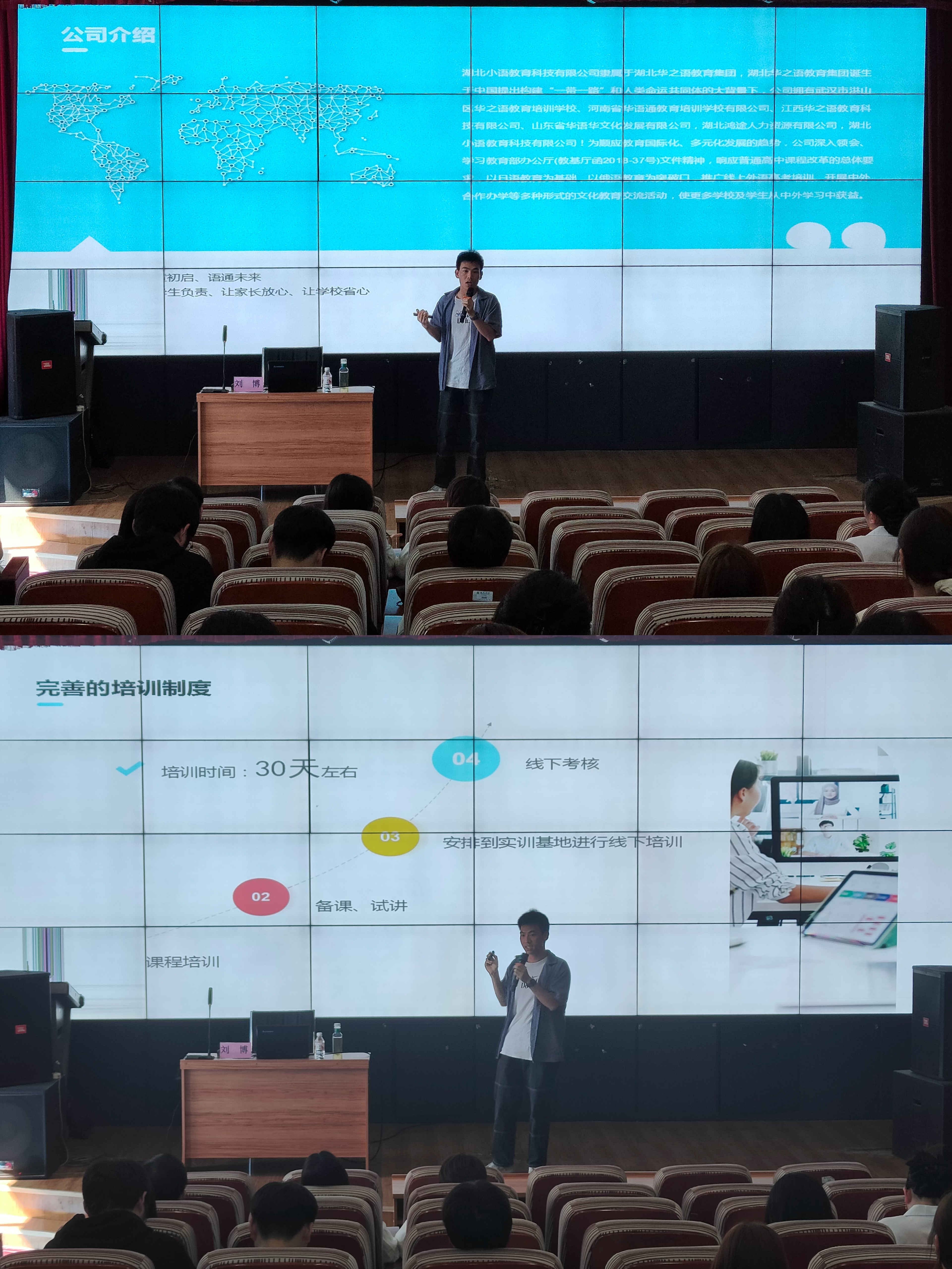 宣讲会上,刘博老师向员工们详细介绍了湖北华之语教育科技公司基本情况、企业对俄语教师储备计划、岗位需求、公司福利、薪资待遇、职业晋升、入职流程等方面。同时建议员工们提前做好职业生涯规划,明确职业目标,以吃苦耐劳的人生态度拼搏未来。