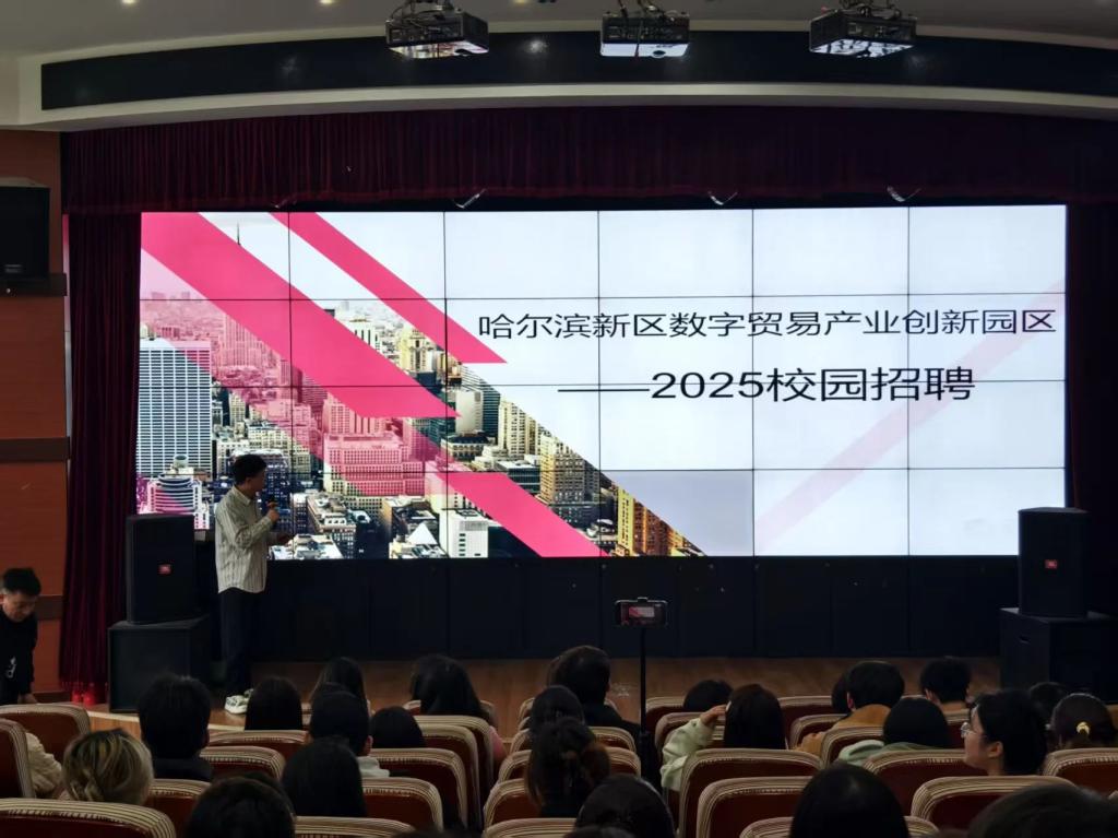 首先,由哈尔滨数字贸易产业园区负责人带来就业宣讲。他围绕岗位需求,详细解读了具体工作内容,结合行业趋势分析岗位发展前景,并通过图片、视频等形式展示了工作地点与环境,帮助同学们直观了解未来的工作场景,为大家勾勒出清晰的职业图景。此外,他还着重强调了园区在跨境电商、数字营销等领域的创新项目,鼓励同学们将语言优势与数字化技能结合,在新兴领域中开拓职业道路;同时分享了园区为员工提供的国际交流机会和专业技能培训体系,助力同学们快速成长。