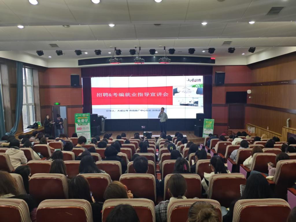 随后,由大威文化培训负责人主持宣讲,大威文化培训负责人不仅介绍了大威文化培训的情景模拟教学、互动式课堂等教学模式,以及由资深教师和行业专家组成的团队团队,还结合自身经验,为同学们分享了外语专业考研考公的备考要点和实用建议。谈及职业发展,大威文化培训负责人还为同学们分享了公司完善的晋升体系和丰富的学习资源,包括定期专业培训、国内外交流机会等。在互动环节,大威文化培训负责人细致解答了同学们关于教学任务、薪资构成、考研考公规划等问题,鼓励同学们发挥自身优势,尽早明确发展方向。
