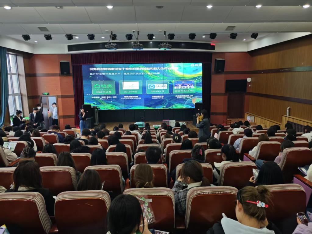 首先,北京链家负责人用通俗的语言详细地为同学们讲解了链家如何通过线上平台和线下门店开展房屋交易服务。他重点介绍了“新人护航计划”,详细说明了老员工带新人的“师徒制”培养模式,以及业绩提成、季度奖金、带薪年假等薪资福利。宣讲结束后,北京链家负责人组织抽奖活动,送出小礼品。在互动答疑环节,北京链家负责人耐心解答了同学们关于工作地点分配、晋升空间等问题,并邀请大家加入链家。