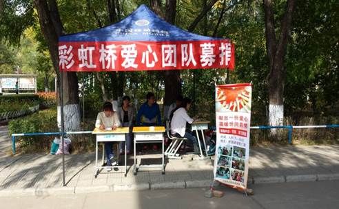 寒冬即将来临,福利院的孩子们还没有充足的过冬衣物,于是彩虹桥向全校师生发起了号召,为那些可爱的孩子们举行募捐活动。成员们支起帐篷,挂起横幅,准备好记录单,等待着捐赠物品的老师同学们的到来。路过帐篷前的的老师和同学纷纷驻足询问,并捐出了自己的衣物和学习用品,甚至有的同学将现金转化为物品积极送到募捐现场,令人感动不已。此种情况不胜枚举。