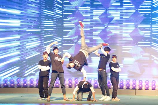 伴随着音乐的响起,在CD 街舞工作室演员激情的开场舞《EVA 》中拉开了迎新晚会的帷幕。歌伴舞、舞蹈、武术、独唱、二胡、俄罗斯舞蹈等精彩节目为观众呈现了丰富的视觉盛宴 ;