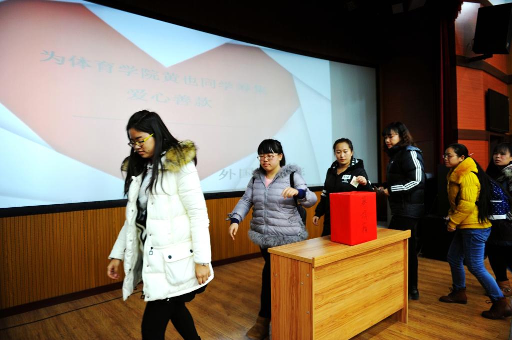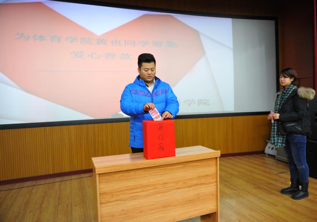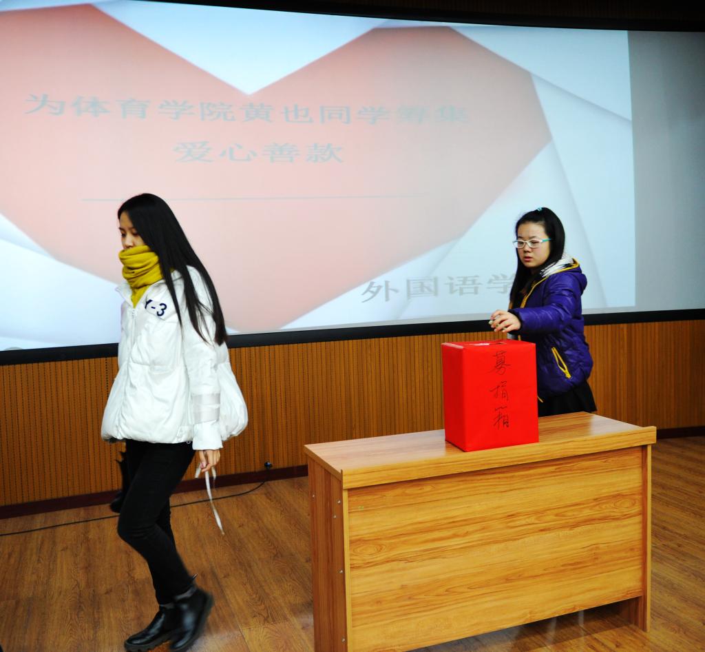 仪式由青年志愿者联合会主席赵一博主持,赵一博主席向同学们讲述了黄也同学的遭遇后,同学们都表示要奉献出自己的一份力量。捐款是以募捐箱的形势举行的。首先由各班班长率先代表班级捐款,随后由先进党员、入党积极分子及全体员工会成员自由捐款,同学们为了让黄也同学能早日回到我们的身边都献出了自己的一份爱心。