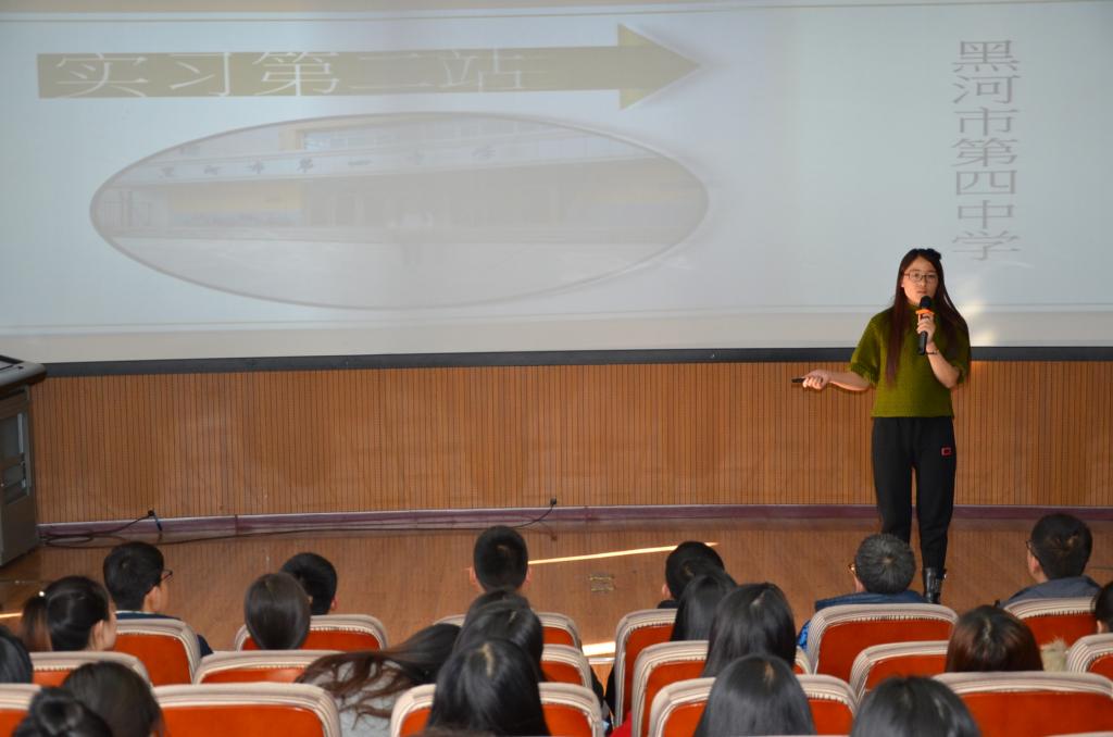 徐婷婷同学曾在幸福中学和黑河市第四中学任教,她表示这两所学校的教学理念都是主张把课堂交给员工,而非老师主讲员工主听的模式。她告诉我们,她在实习中学到的教学之道就是贴近员工,只有和员工做朋友,深入他们的内心才能明白员工所需。她也提醒师范类的员工,在以后的教员工涯中,遇到特殊员工要站在他们的角度去想问题并解决问题。在商务方面,她也提醒我们在求职时要注意提高警惕。