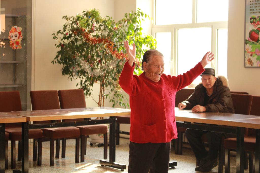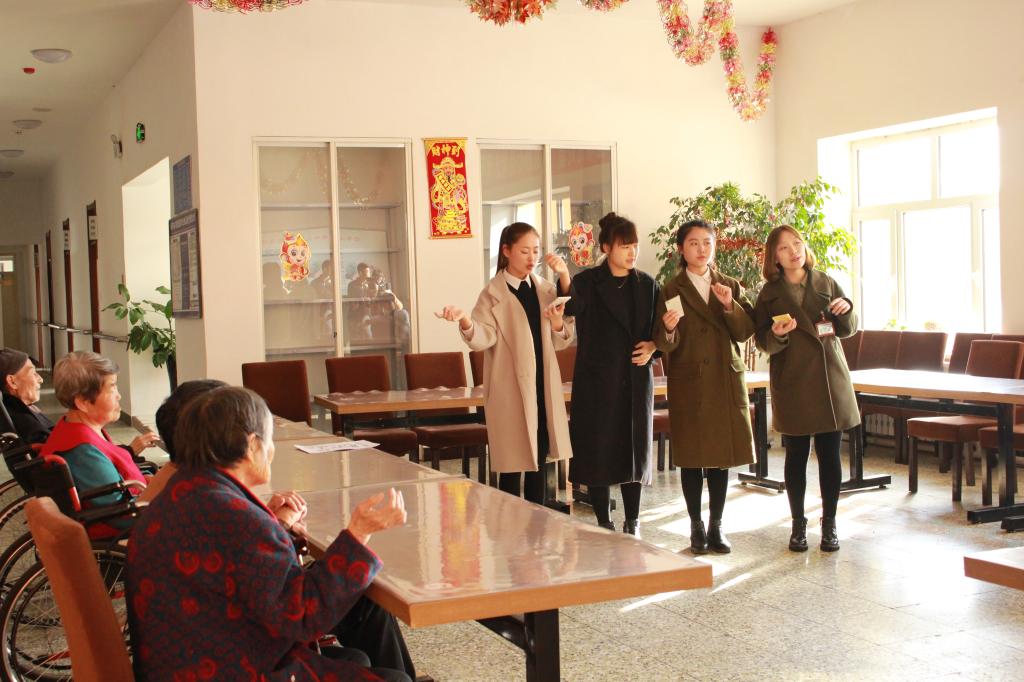 下午2点多部分成员集体到达敬老院,一进门便看到敬老院宽敞的院子,里面有很多为了给老人强身健体运动器材,些许老人在院子里休憩,刚进去屋内时,同学们对于新的环境还有一些不适应表现上也有些拘谨,以至于不敢与老人们亲切的打招呼。在经过短暂的适应后同学们和老人很快相处的融洽。同学们还参观了老人的食堂,在那里大家简单的表演了事先准备好的节目,大家一起演唱了《阳光总在风雨后》。