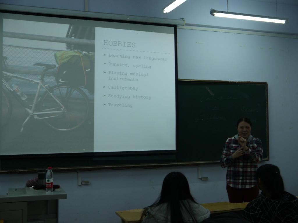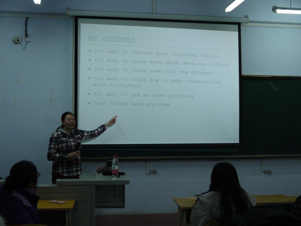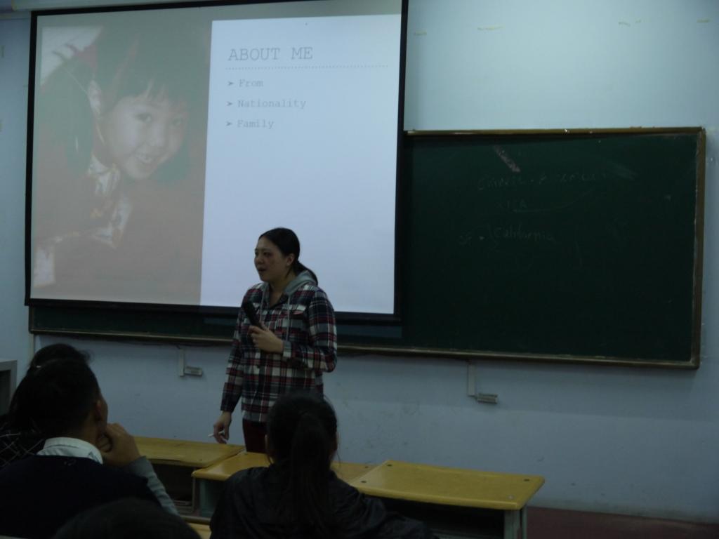 Jacky Quan 用生动有趣的话语讲述了关于她的故乡—洛杉矶加利福尼亚州,她的家族—父母都是中国人,有五个兄弟姐妹,她的兴趣爱好—弹奏很多乐器,喜欢学习外国语言类如汉语俄语、喜欢骑单车这项户外运动、她喜欢去世界各地旅行,她觉得黑河是一个很棒,很美丽的城市,她谈到中国的朋友的待人非常友善,热情。她很喜欢研究中国悠久的历史文化,与美国的历史岁月相比很不可思议。中国各地具有特点的美食,四川的麻辣,让人欲罢不能的臭豆腐等。她风趣幽默的授课方式引得同学们极大的热情与专注。