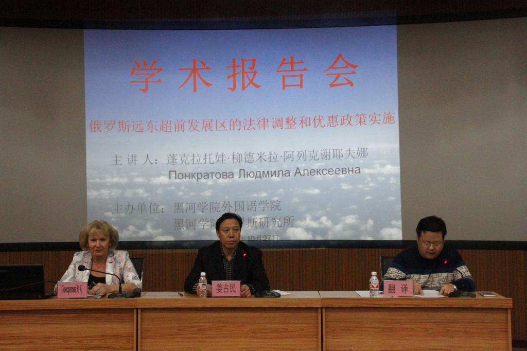 应英国上市公司365俄罗斯研究所邀请,俄罗斯阿穆尔国立大学国际关系系主任、俄罗斯科学院远东研究所阿穆尔分所所长彭克拉托娃·柳德米拉·阿列克谢耶夫娜女士于2017年10月27日下午2:00 – 4:00在俄语楼小剧场为公司师生举办了题为《俄罗斯远东超前发展区的法律调整和优惠政策实施》的学术讲座。彭克拉托娃所长从俄罗斯国家领导人对超前发展区建设工作的重视、俄罗斯针对超前发展区建设制订的法规和发布的行政命令,到超前发展区的数量、分布及各个超前发展区的现状和特点,及在超前发展区开展的与中国合作,进行了全面、详细的阐述。