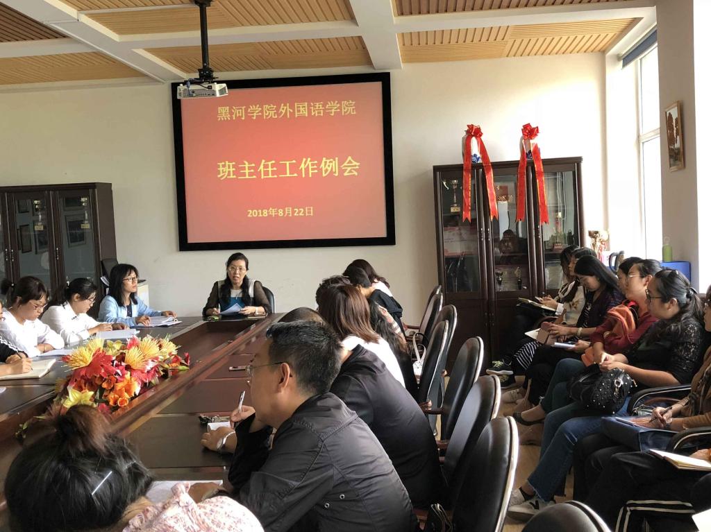 2018年8月22日15时,党总支书记孟繁红、副书记常丽坤、学工办主任潘云辉及全体辅导员及班主任在俄语楼300开展了本学期第一次班主任工作会议。