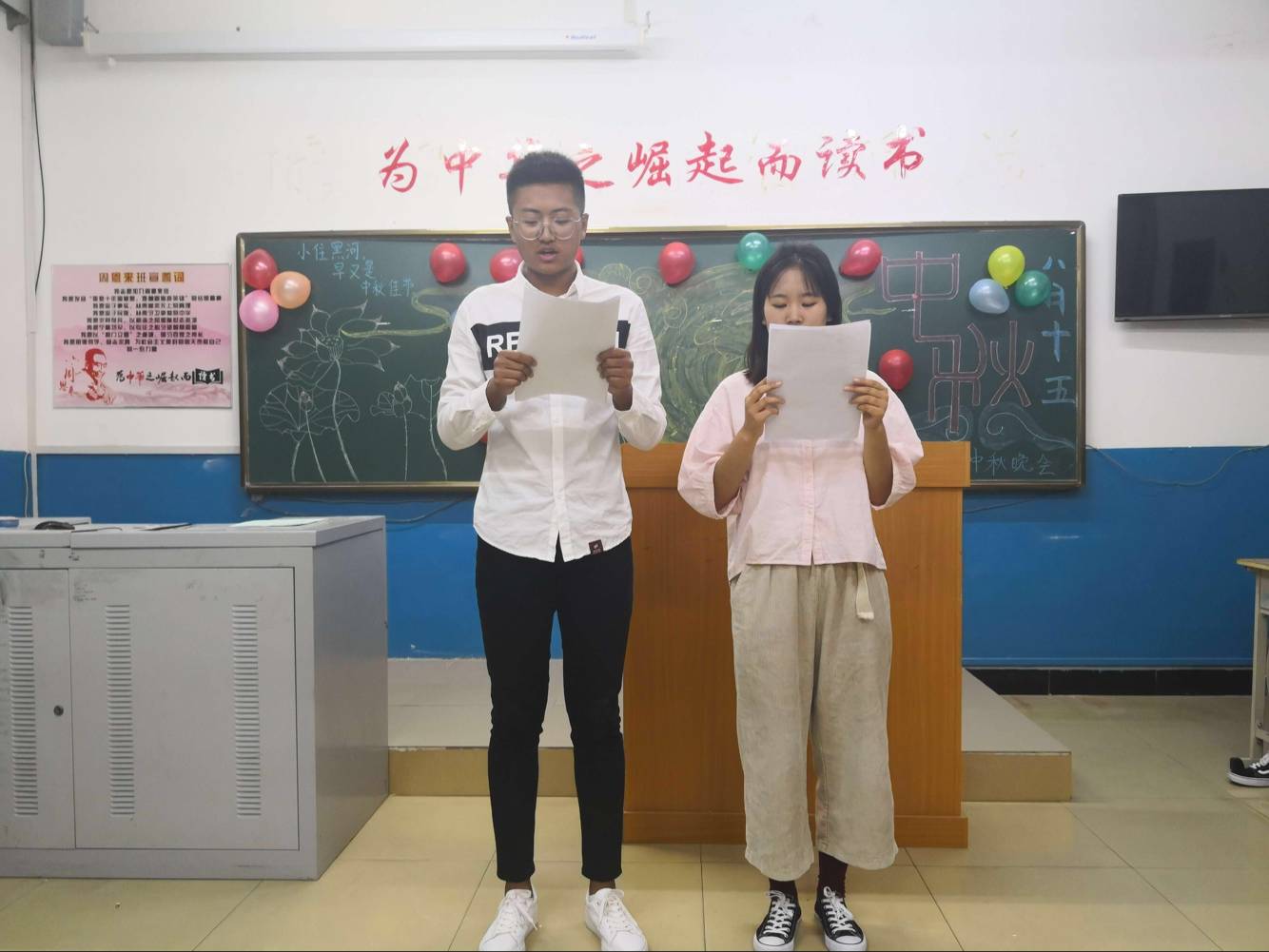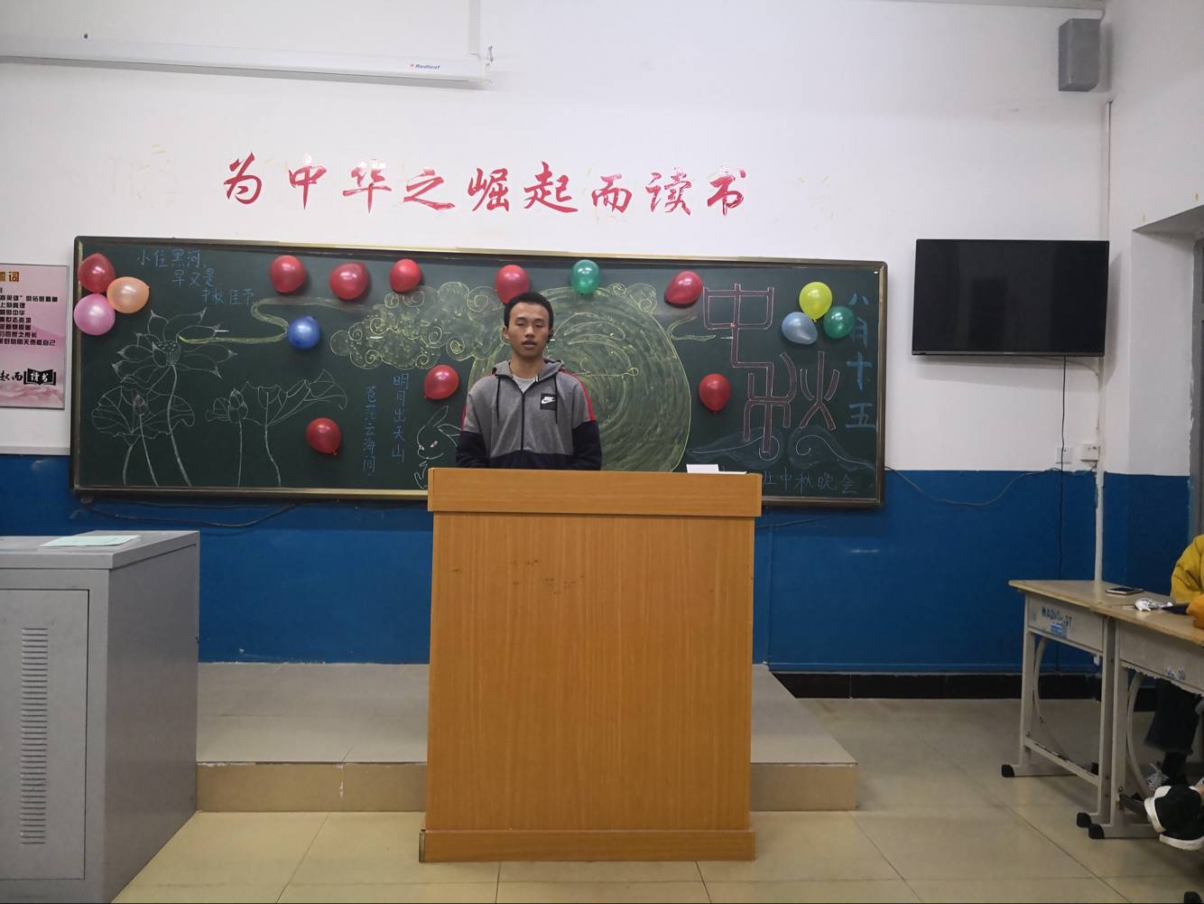 下午4点开始,同学们就进入了紧张的准备状态,在黑板上描绘出一幅幅美丽的黑板画,有的同学通过查阅资料,向大家介绍了中秋节的来历,还通过古诗词诵读、歌、舞表演等多种形式了解中国这一传统节日习俗,增强了我是中国人的自信和骄傲。班主任郗老师提前来到班级跟同学聊天,了解同学们的近况、来到学校的心理感受和最近生活中的趣事,时不时班级中洋溢着欢快的笑声。