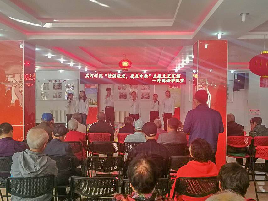 本次活动在彩虹桥爱心团队为老人们带来的合唱歌曲《国家》中拉开帷幕,高亢激昂的旋律将本次慰问演出推向了高潮,接着由彩虹桥爱心团队文艺部演唱的歌曲《相亲相爱》勾起了老人们对年轻岁月的记忆,老人们向同学们讲述了自己的青春故事。老员工近距离与老人接触,陪老人们聊天、帮助老人们做家务,使老人们感受到了家的温暖。活动中所有成员互相配合、尽职尽责。在给老人带去欢乐的同时,也在实践中传递爱心。