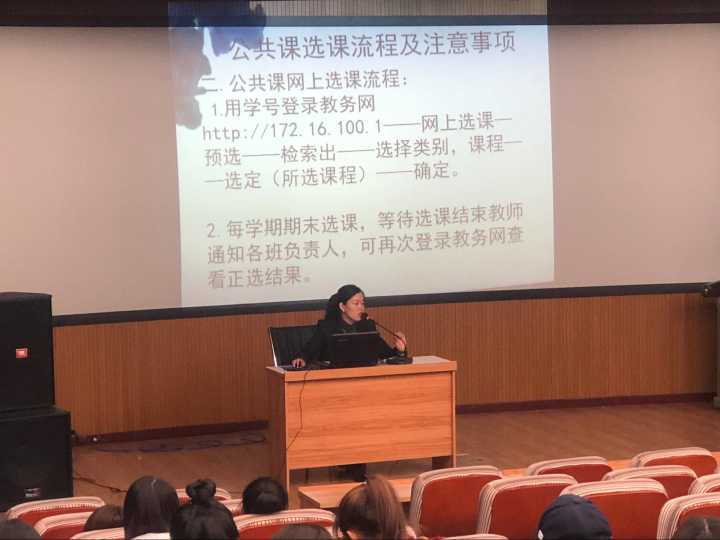 2018年10月22日19点整,在俄语楼小剧场举办了2018级新生教务培训讲座。吕晓姣老师向在座的同学们介绍了公共选修课的重要性,并为同学们耐心地介绍了选择公共选修课的流程及注意事项,其次以体育课补选为例向大家介绍了公选课补选的相关事宜,在吕晓姣老师的讲解下,同学们很好的了解了体育课选课流程及注意事项。