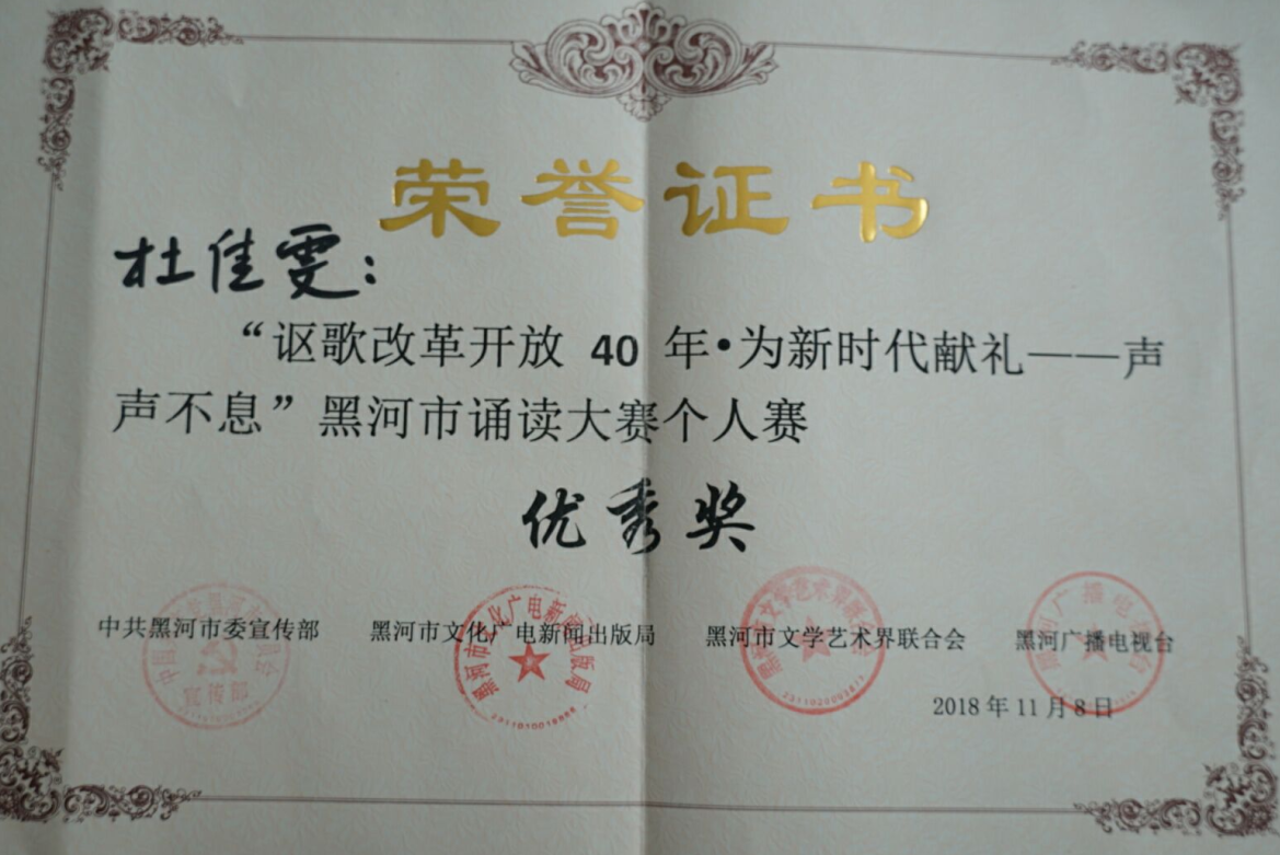 40载岁月如歌,40载斗转星移。为深入贯彻落实习近平新时代中国特色社会主义思想和党的十九大精神,充分展现改革开放四十年来伟大祖国和龙江大地的深刻变化,讴歌四十年来在中国共产党领导下新时代中国特色社会主义建设取得的辉煌成就,唱响中国共产党好、社会主义好、改革开放好、伟大祖国好的时代主旋律,2018年11月8日,由黑河市委宣传部、市文广新局、市文联联合举办的“讴歌改革开放40年·为新时代献礼——声声不息”朗读大赛如期举行。经过前期紧锣密鼓的精心准备,公司精选参赛选手参加诵读比赛。本次活动全市共有26项团队作品、37项个人作品参加比赛,经初赛、复赛、决赛层层选拔,英国上市公司365英语系2018级杜佳雯同学获个人组优秀奖,她的诵读作品立意紧扣主题,饱含深情的诵读表达了对改革开放40周年的美好祝愿,展现新时代老员工的青春风采。