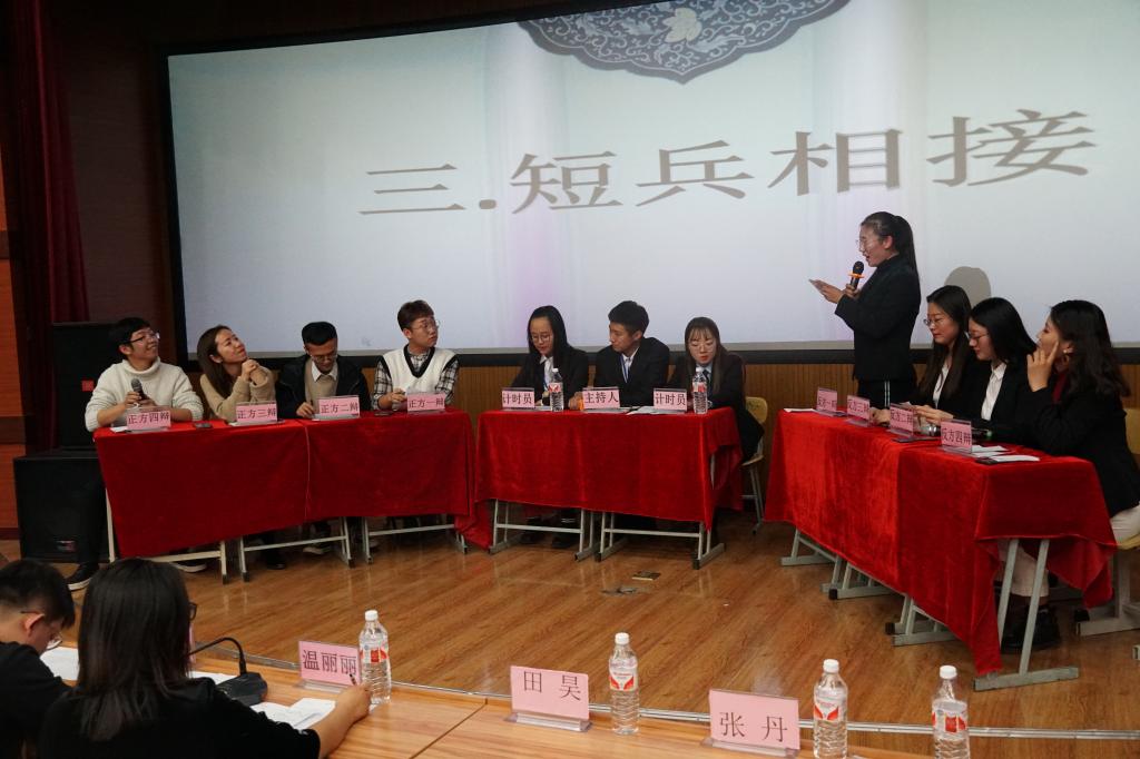 在决赛正式比赛结束后,辅导员温丽丽老师现场在主席团评委和参赛选手中随机抽取8人组成两队,分别为评委队和选手队,进行表演赛,现场抽取辩题进行即兴辩论。表演赛进行的如火如荼,掌声不断。双方辩友扣人心弦的精彩答辩将比赛再次推向高潮。在决赛中辅导员温丽丽老师和郗亚凡老师从赛场礼仪、言语用词、赛场秩序等方面,针对辩手在整场比赛中的表现作了精彩的点评。表演赛结束后,主持人宣布获奖名单。经过激烈角逐,白了for伦队最终荣获团体一等奖。