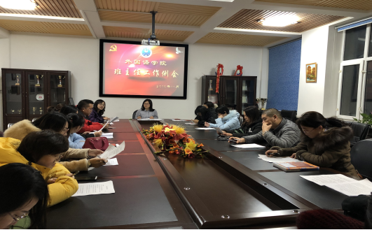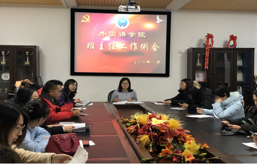 2018年11月21日16时,党总支副书记常丽坤、学工办主任潘云辉及全体班主任在俄语楼300开展了本学期第三次班主任工作会议。
