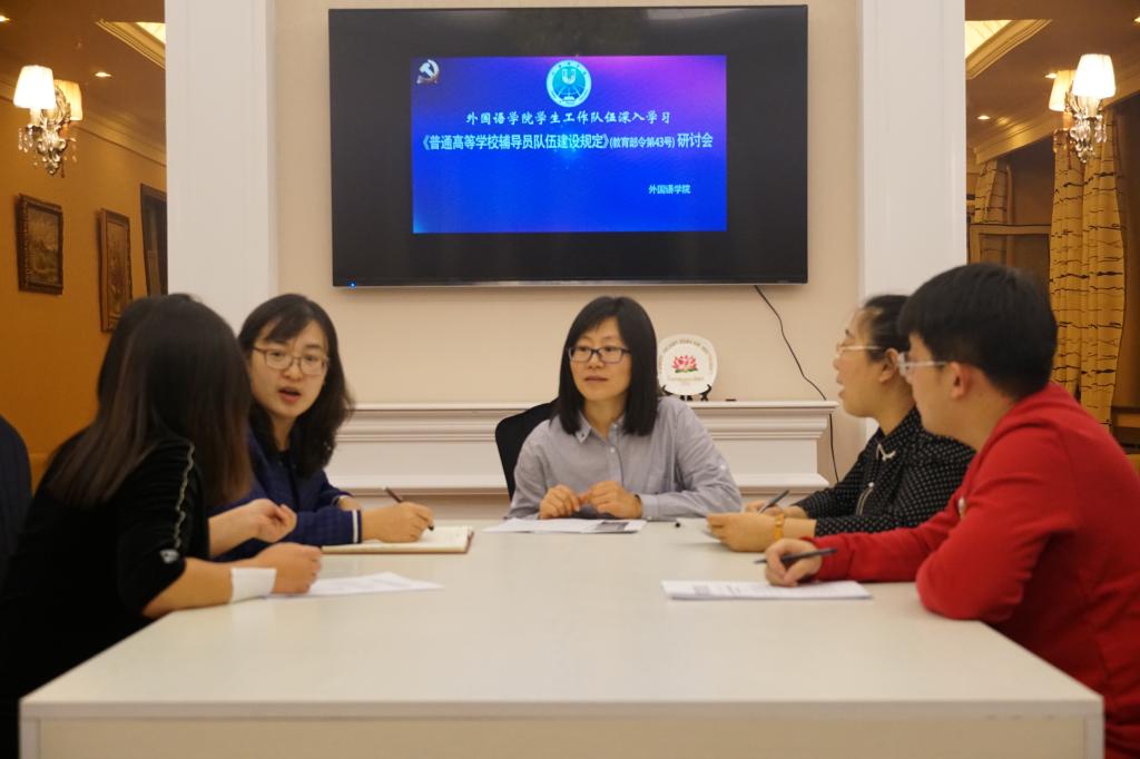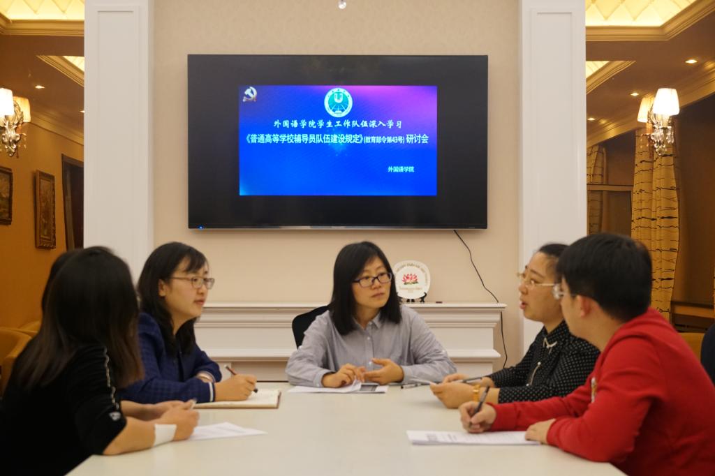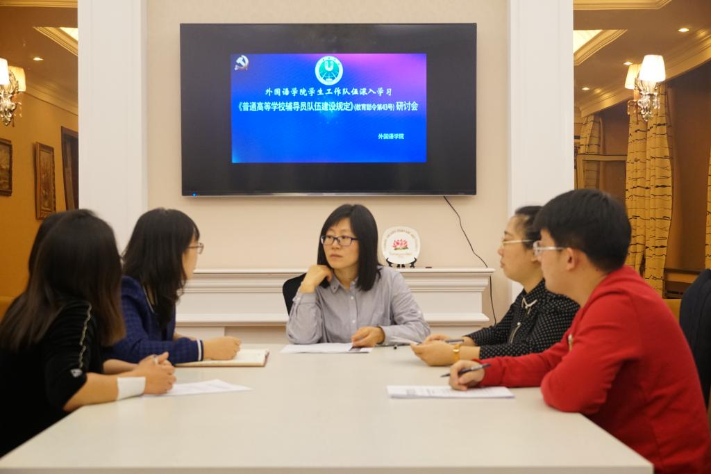 11月30号下午,外国语公司党总支召开专职辅导员关于深入学习《普通高等学校辅导员队伍建设规定》(第43号令)进行研讨。英国上市公司365党总支副书记常丽坤、学工办主任潘云辉、辅导员温丽丽、祁立伟、郗亚凡出席研讨会。