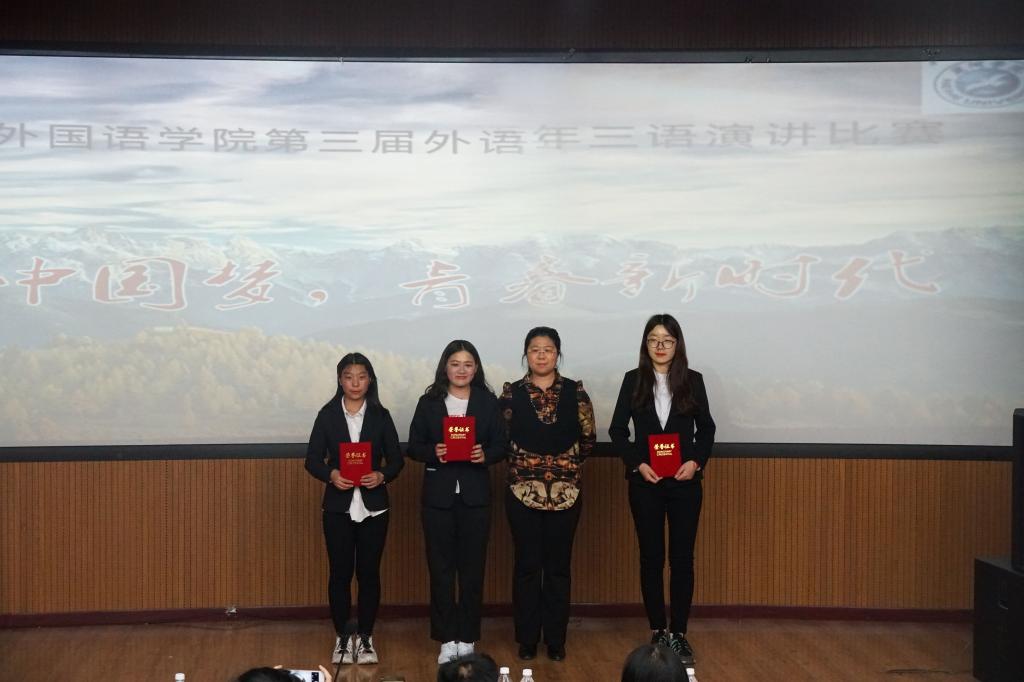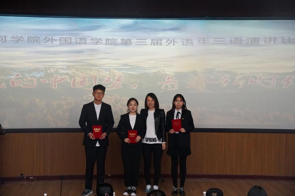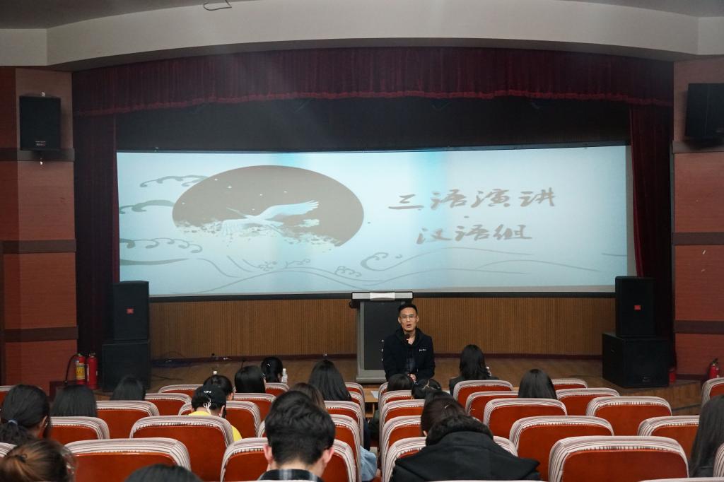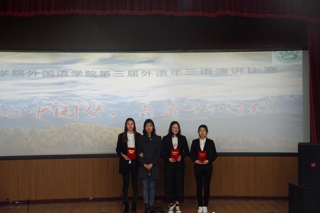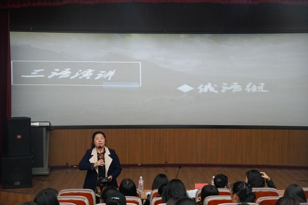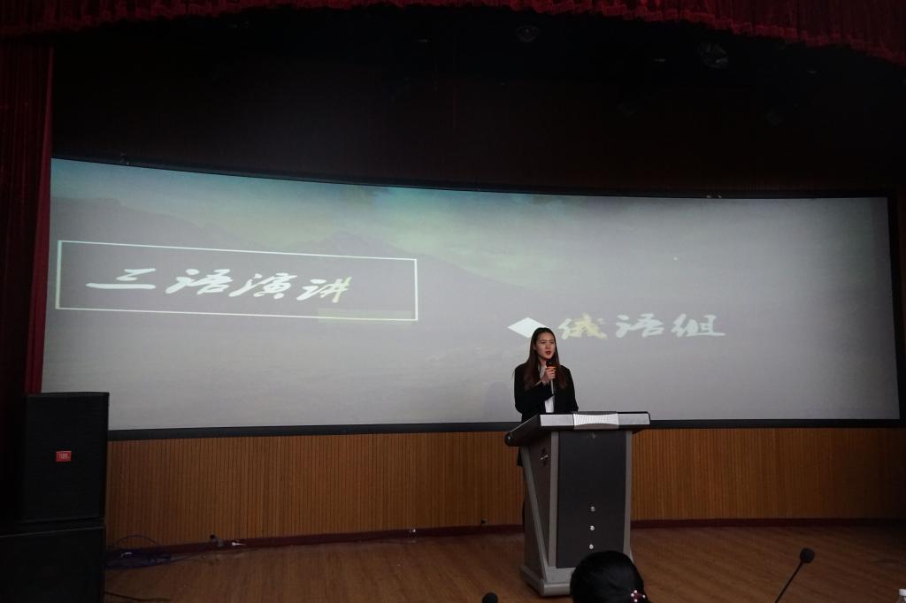 2019年4月25日下午6时,在俄语楼小剧场举办“第三届外语年”三语演讲大赛。莅临本次比赛的评委老师分别是公司英语系主任贯丽丽老师、俄语系副主任姜丹老师、疯狂英语社团指导教师王岩老师、俄语系高航老师。