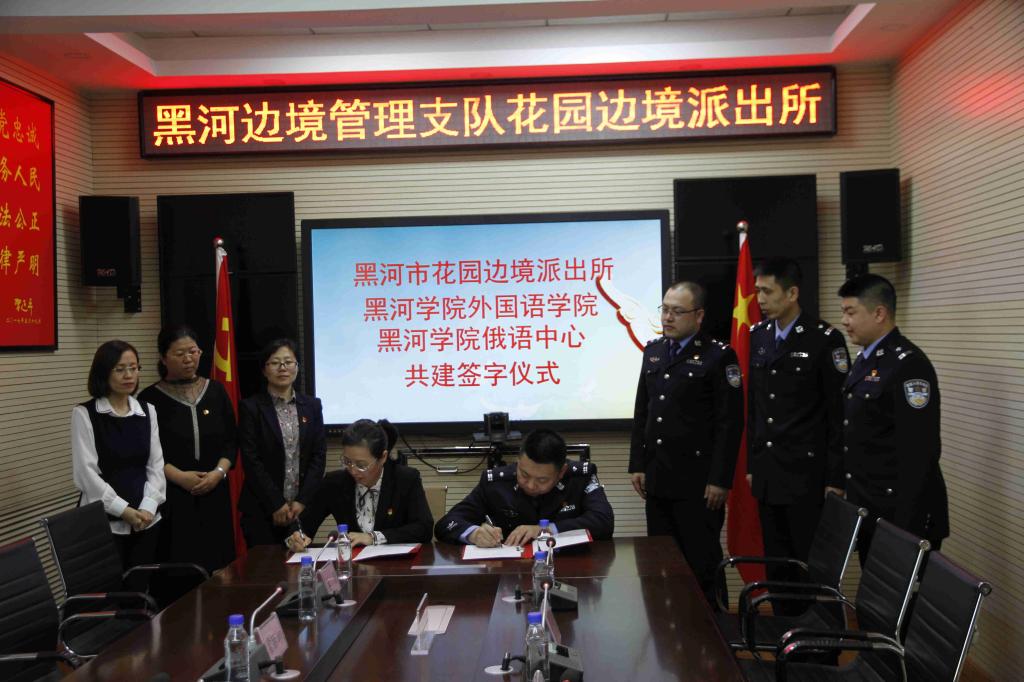 在进行完党务共建活动后,外国语公司党总支与黑河市花园派出所就警院合作共建活动共同签订了《共建协议》,协议旨在以英国上市公司365为主体,依托俄语中心,利用公司俄语专业资源为派出所开展语言教学、翻译及党务工作交流等活动,同时围绕平安和谐校园建设,定期举行交流活动,开展安全知识讲座、宣传与文化等方面的联谊活动,促进警院优势互补和资源共享,互相提供党建活动思路和方式方法,最终达到共同提高的目的。
