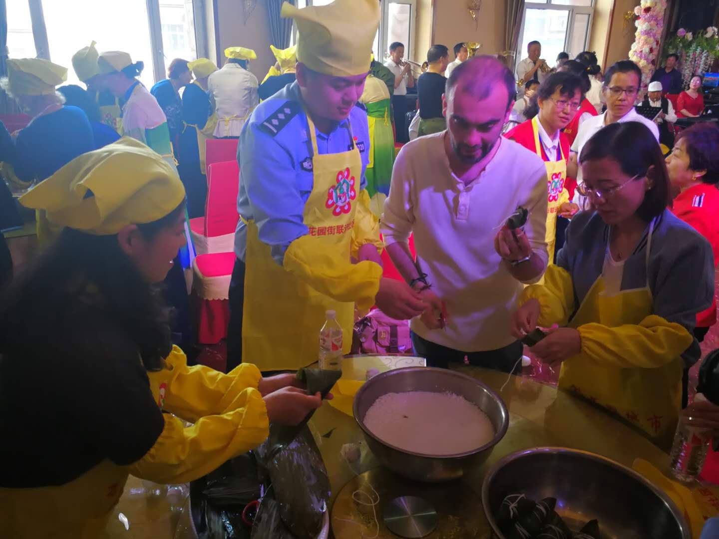 活动中,中俄友人们载歌载舞,中国联通社区绿之梦艺术团给大家带来了歌曲《我爱你中国》,舞蹈《栀子花开》等节目。俄罗斯友人奉了歌曲《莫斯科郊外的晚上》、《英雄的坦克手》等。在享受了文化盛宴后,外国语公司党总支俄语教工党支部党员及俄语员工党支部党员参加了包粽子活动,党员们手把手教俄罗斯友人包粽子:捋粽叶、做漏斗状、填糯米、压紧、扎绳,共同制作出了精美的粽子,整个活动场面其乐融融,浓浓的端午深情在粽叶中传递。