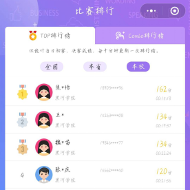 初赛共分为两场,11月4日,比赛正式开始,每一位选手都做足准备,满怀信心,用自己最佳的状态来参加比赛。竞赛题目包含了听力理解、单项选择、完型选择,词汇范围也扩大了很多,包括托福、雅思等,但题目的难度并没有难倒大家,每位参赛选手的答题速度以及准确率都可以看出他们对于本次比赛的认真程度。时间不会辜负每一个努力的人,相信每一位认真的选手都可以得到自己满意的成绩!因为比赛采用答题积分累积的形式进行排名,因此在11月6日初赛结束后,排名前100名的参赛选手入围决赛。恭喜所有进入决赛的选手在众多选手中脱颖而出。