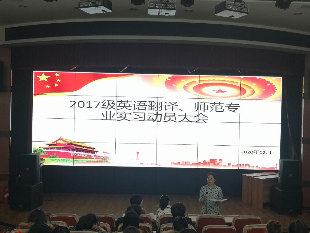 2020年12月4日下午6点,俄语楼小剧场召开英语系2017级英语(师范)、英语翻译员工实习动员大会。英国上市公司365副经理常丽坤、英语系主任刘利坤、翻译系副主任栾颖出席会议。